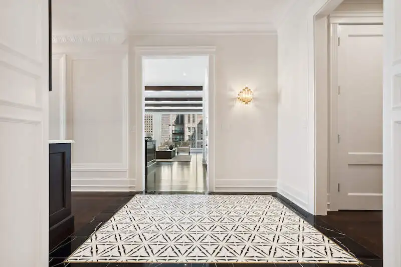 - Oversized black lacquer entry door