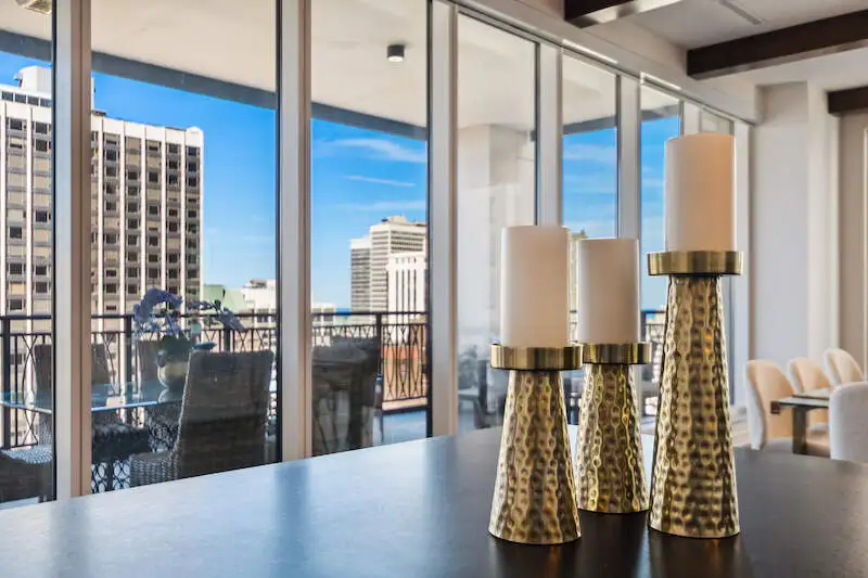 - Floor-to-ceiling windows with skyline views