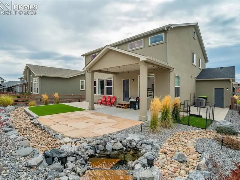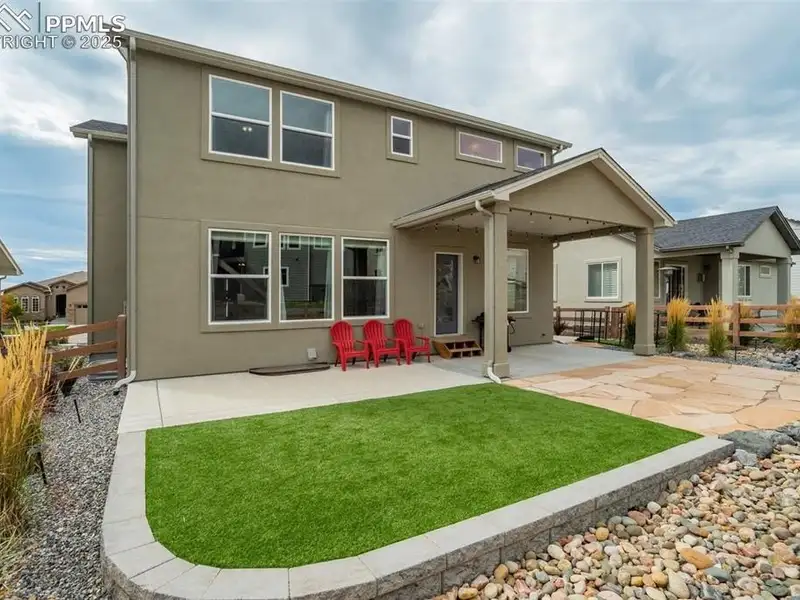 - Landscaped backyard with covered patio