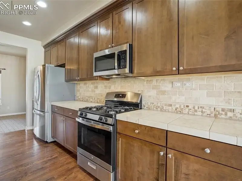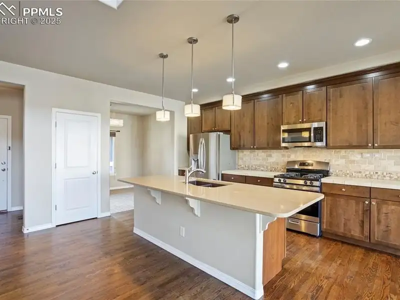 - Kitchen with quartz island and gas range