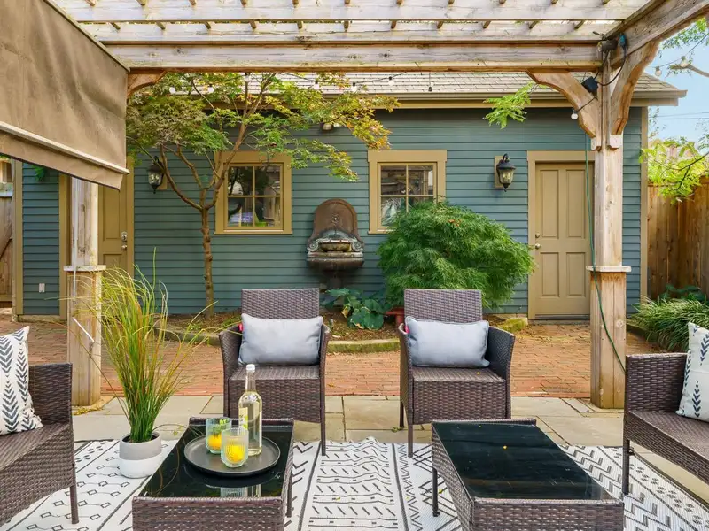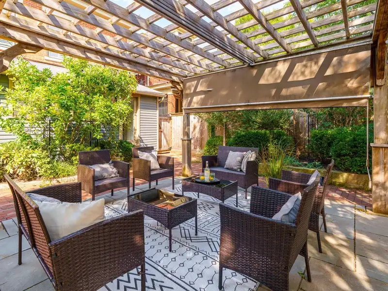 - Private fenced patio with pergola