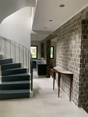 P. B. Hall de entrada; amplio living comedor con estufa hogar y biblioteca, con ventanales al parque y pileta de natación, recientemente construida. La cocina está recién remodelada e integrada con barra y mesada, ambiente muy funcional; escritorio (opcional dormitorio ); toilet de recepción con ducha; habitación y baño de servicio; lavadero; cochera cubierta para un auto.