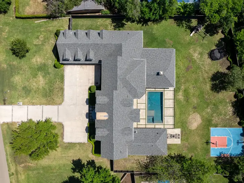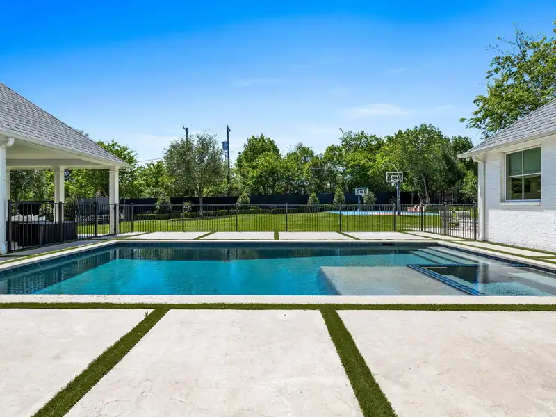 - Private backyard with pool, spa, fire pit, sport court