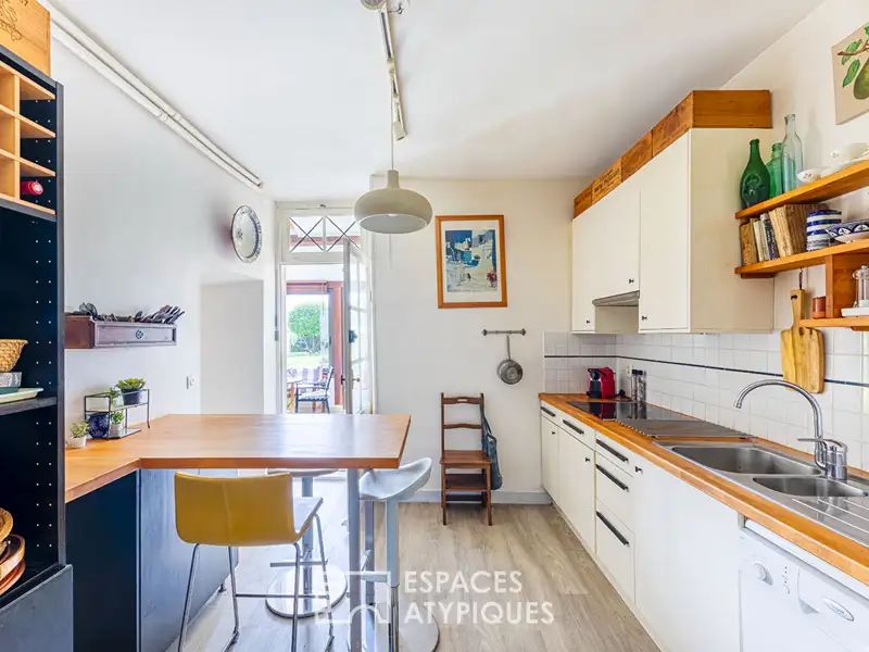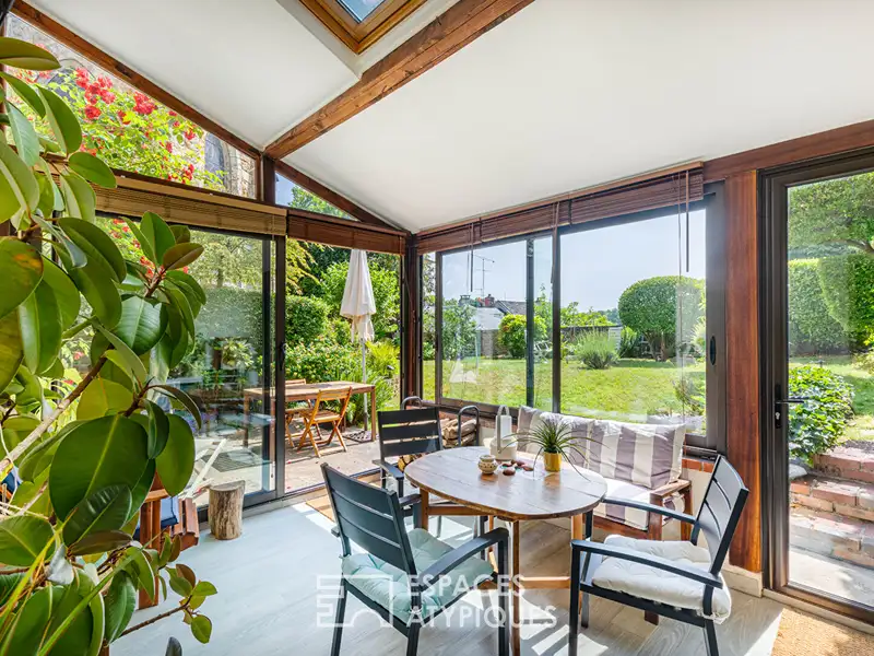 The whole, bathed in light, invites relaxation and naturally extends into a veranda which opens onto an enclosed garden, a veritable green setting in the city center, sheltered from view.