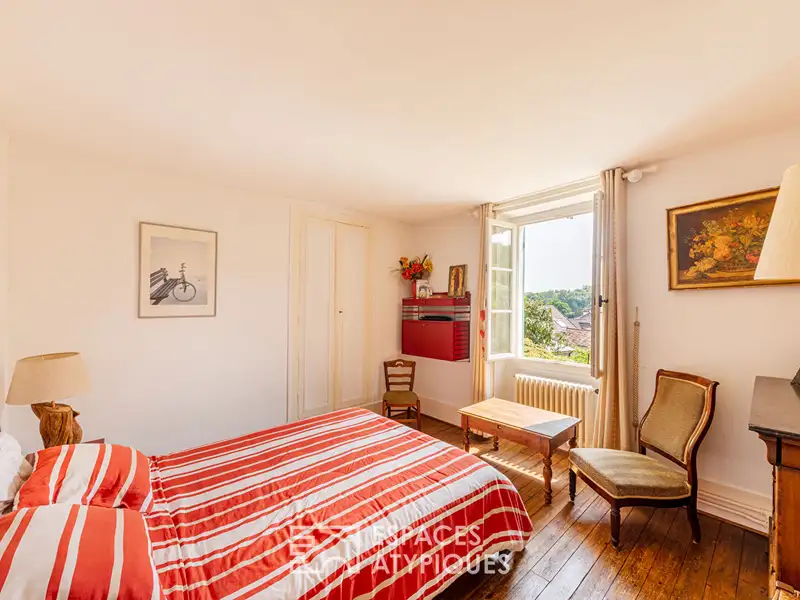 On the first floor, the landing leads to two pretty bedrooms, a bathroom and an office, easily adaptable into an extra bedroom or a teleworking space according to individual needs.