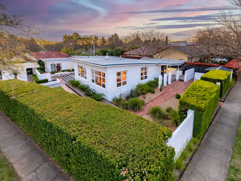 Tucked discreetly behind a lush, manicured hedge and beneath the dappled canopy of stately Chinese elm street trees, this distinguished residence is a rare offering in one of Canberra's most sought-after enclaves. An architectural gem, this iconic Deakin home blends timeless mid-century modernism with sophisticated contemporary updates-offering an exceptional lifestyle just moments from the lake, the Private Hospital, and the vibrant EQ business precinct.