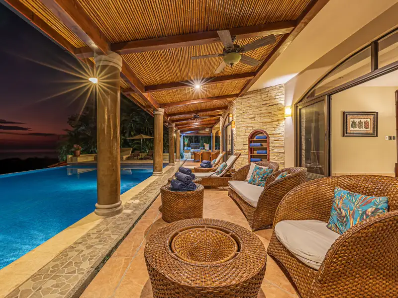 Venture outdoors to indulge in resort-style living: lounge on the massive infinity pool’s sun-kissed recliners, dine al fresco at the teak table, or cook in the outdoor kitchen with a built-in BBQ, sink, and burner. The covered patio creates a perfect retreat for relaxing while enjoying the gentle surf sounds and panoramic vistas. Surrounding the villa are lush gardens, ample outdoor furniture, and a private yard—an idyllic setting for weddings, yoga retreats, or exclusive getaways.
