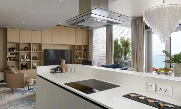 - Fully-fitted open kitchen with high-top island