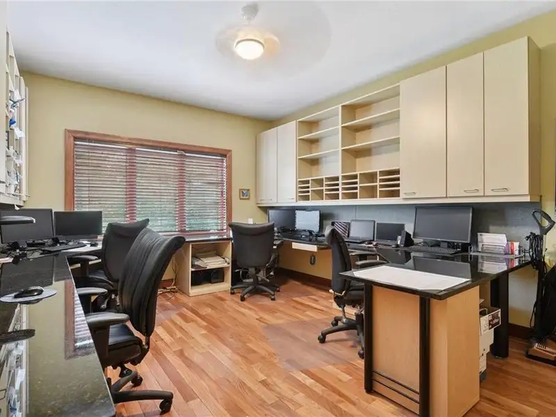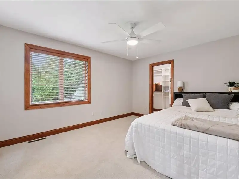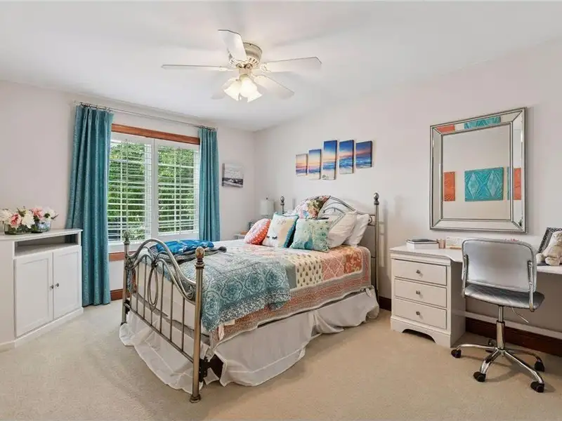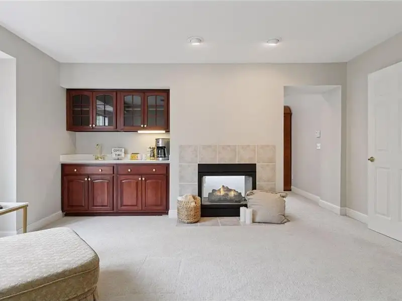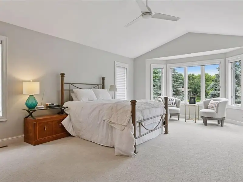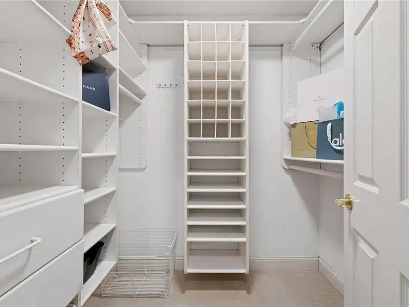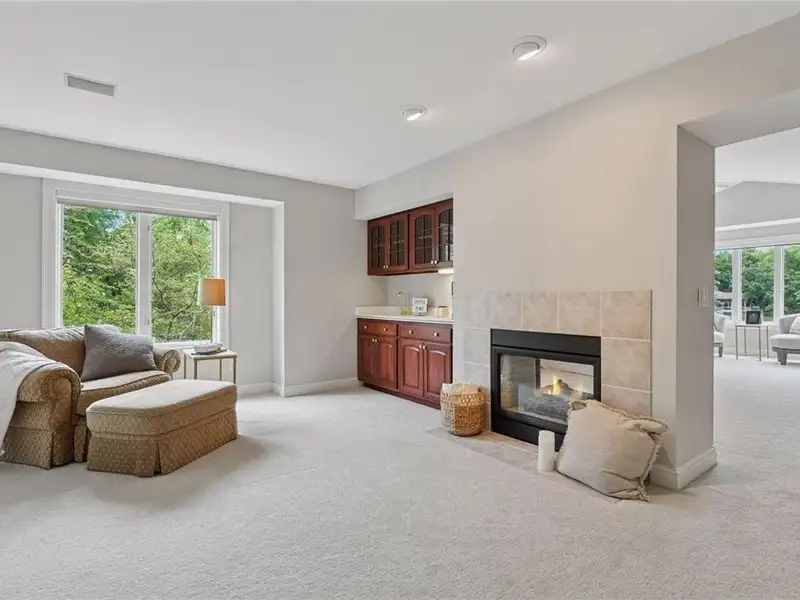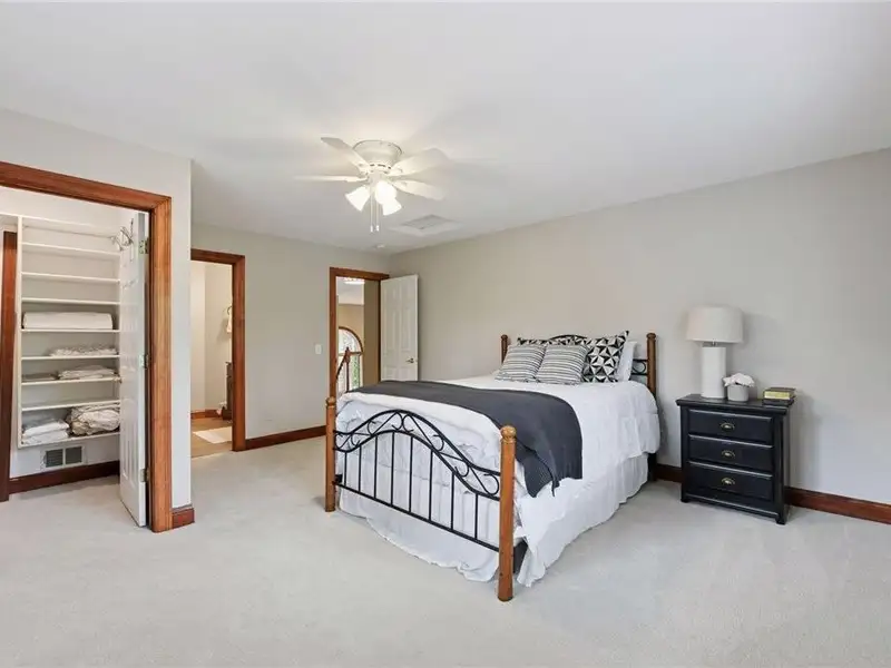 Upstairs, you will find new carpet throughout. The primary suite includes a bay window sitting area overlooking the lake, along with a two-sided fireplace separating the bedroom from the sitting area with a coffee bar. It also features two primary closets with California Closet systems and a luxurious primary bath. One of the additional bedrooms has an ensuite bathroom, while the other two bedrooms share a full Jack and Jill bath. A catwalk separates the three additional bedrooms from the primary suite, and all bedrooms have California Closet systems.