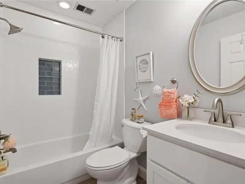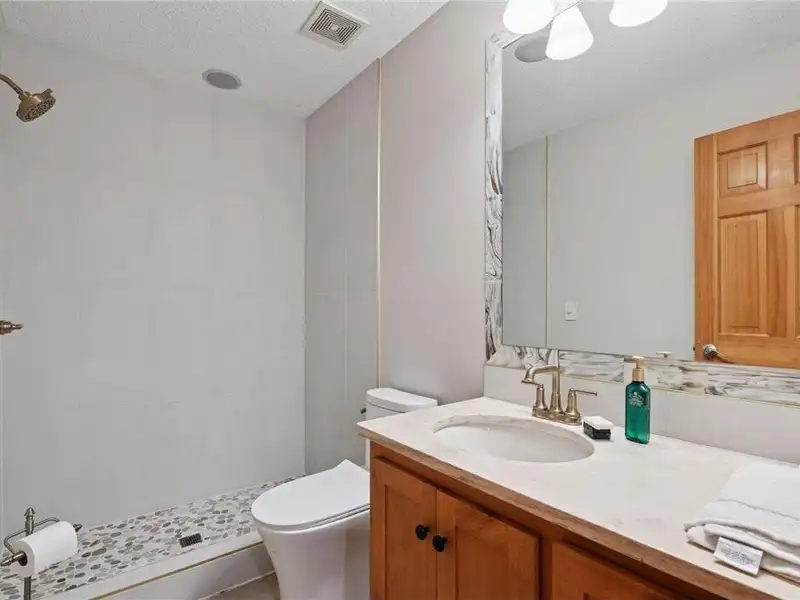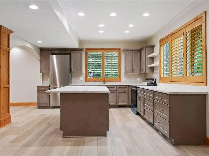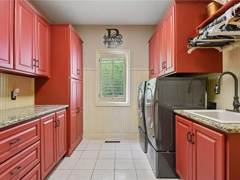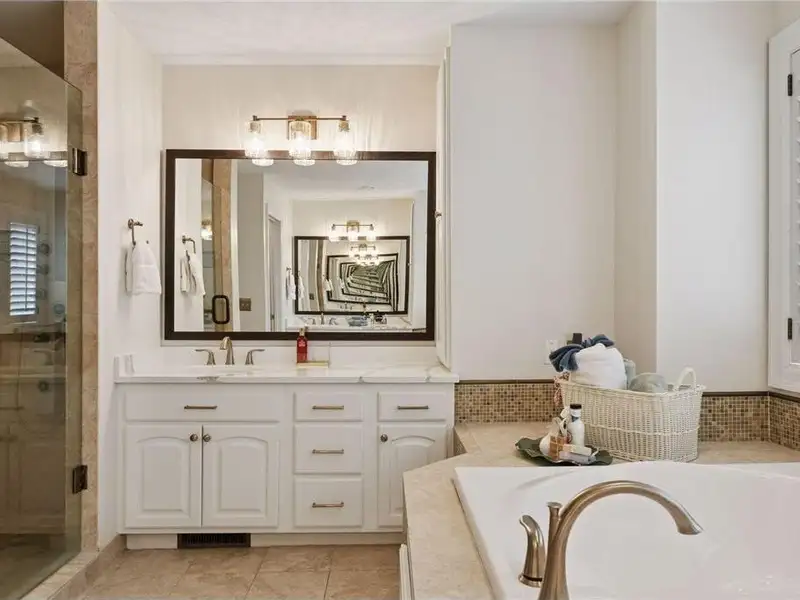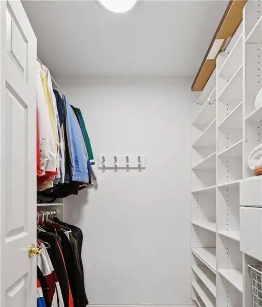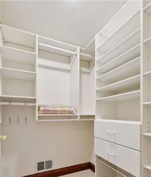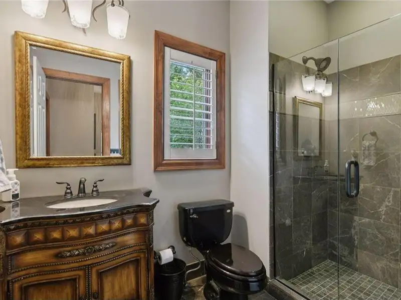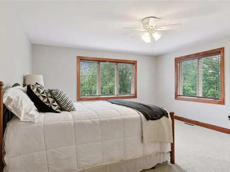 Upstairs, you will find new carpet throughout. The primary suite includes a bay window sitting area overlooking the lake, along with a two-sided fireplace separating the bedroom from the sitting area with a coffee bar. It also features two primary closets with California Closet systems and a luxurious primary bath. One of the additional bedrooms has an ensuite bathroom, while the other two bedrooms share a full Jack and Jill bath. A catwalk separates the three additional bedrooms from the primary suite, and all bedrooms have California Closet systems.