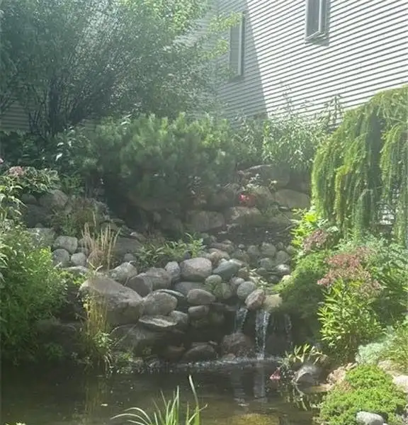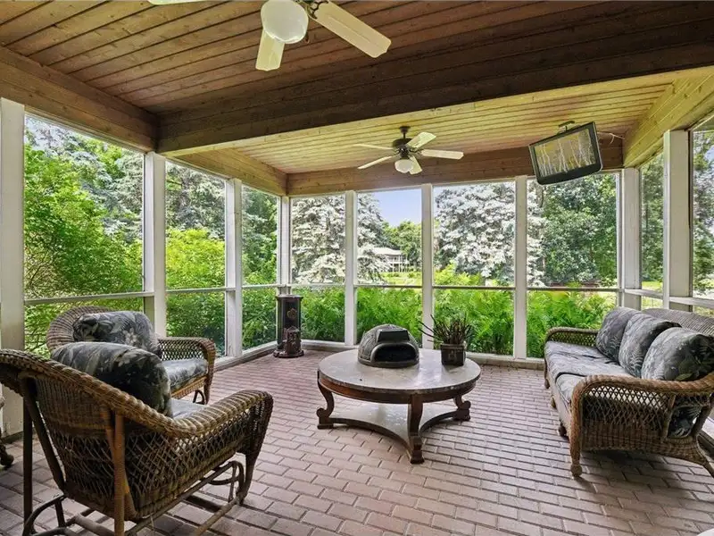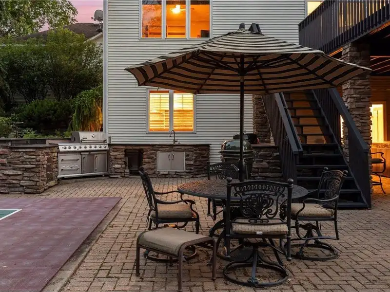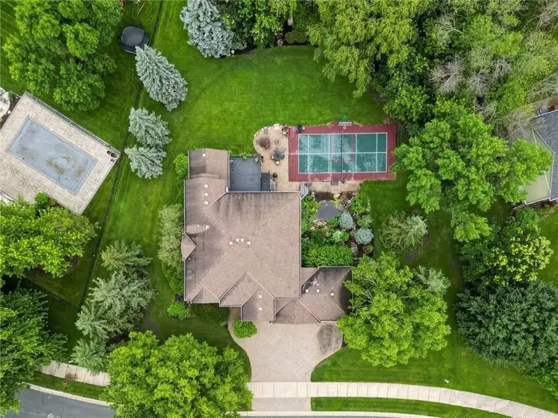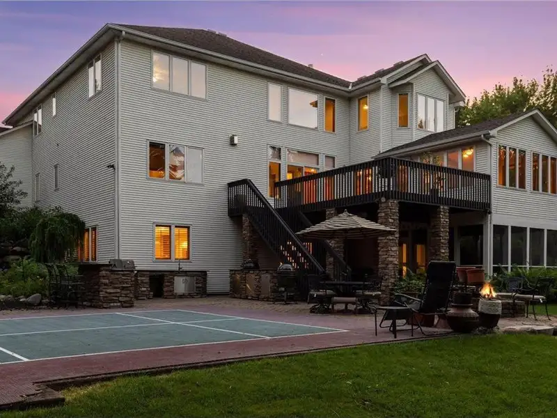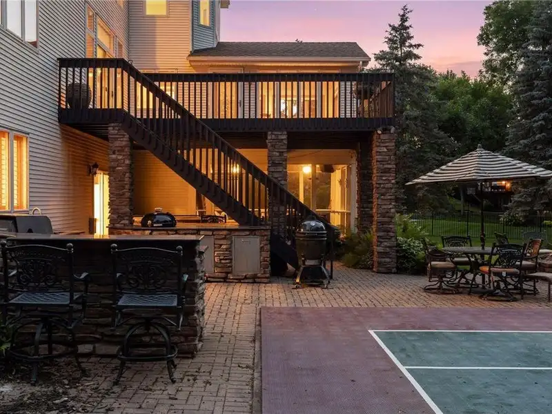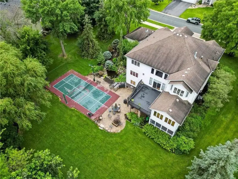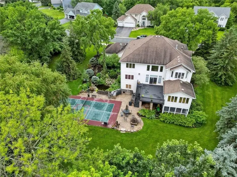 The backyard boasts a sports court the legal size of a pickleball court, equipped with a basketball hoop. It also includes a full stainless steel outdoor kitchen, a koi pond with a waterfall, a fire pit, and a hot tub. Enjoy beautiful outdoor living spaces, including a 16 x 16 screened porch and an oversized deck.