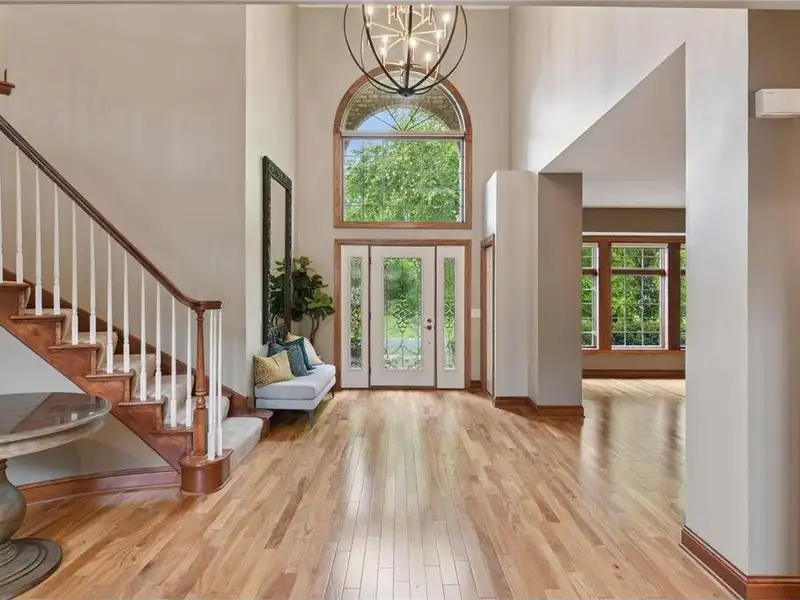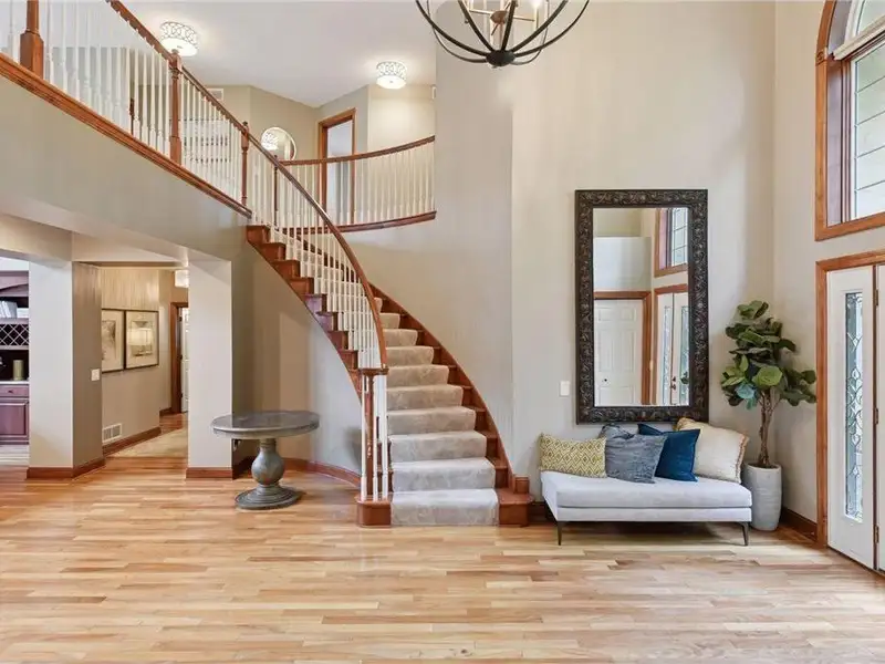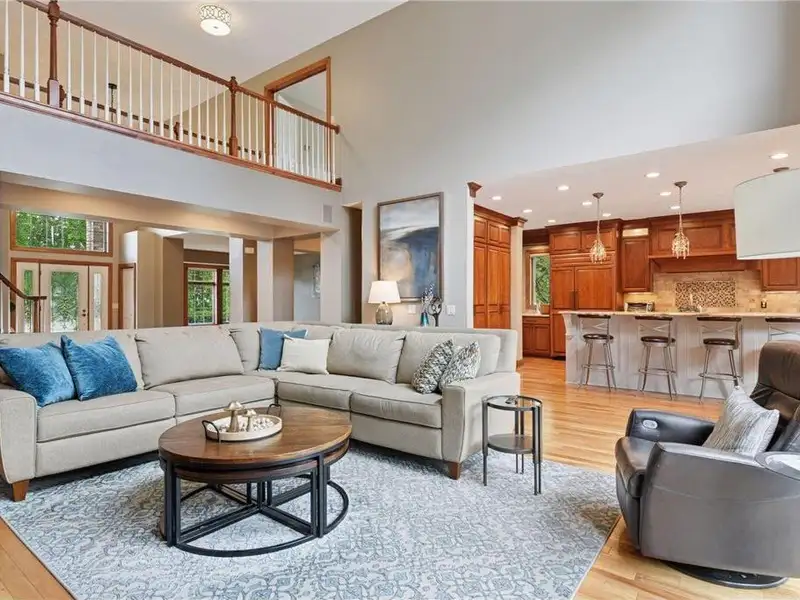 As you enter the home, you'll be greeted by a stunning spiral staircase. Formal living and dining areas, creating a very open floor plan. The two-story family room has a full wall of windows facing the lake, allowing for plenty of natural light. The newly remodeled kitchen features high-end finishes and appliances, along with new hardwood flooring on the main level. You will also find a breathtaking sunroom and a main floor office with built-in workstations, which could be converted into a main floor bedroom. The property includes a four-car garage with built-in and overhead storage, heated and featuring a drain in the fourth stall.