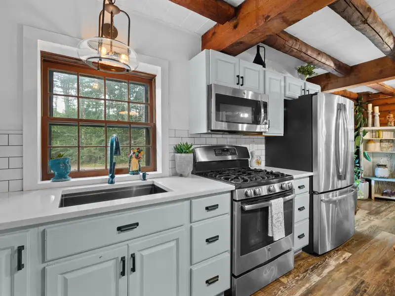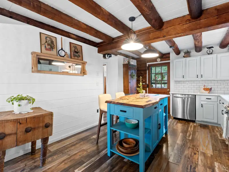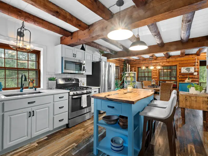 - Live edge island in stylish kitchen