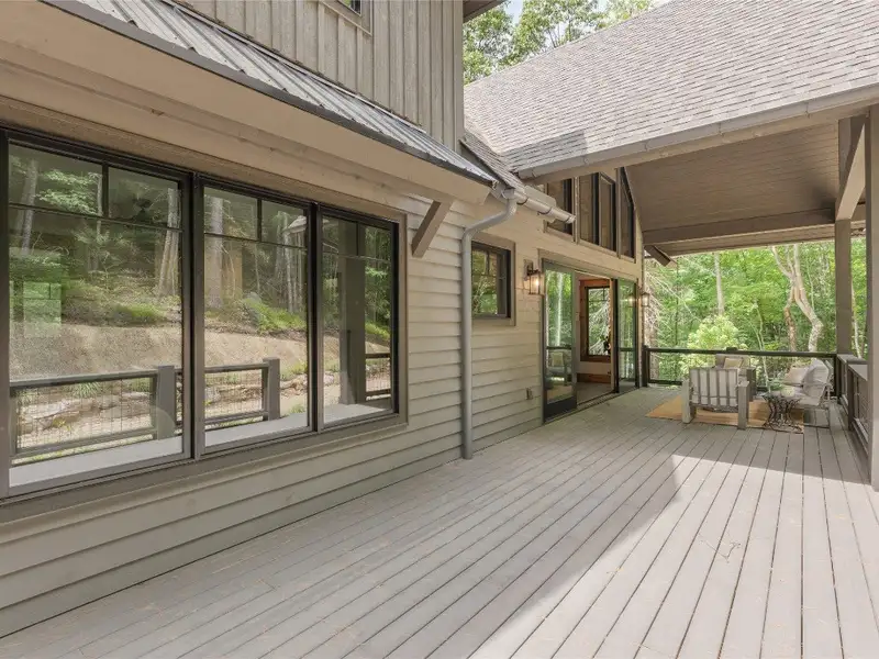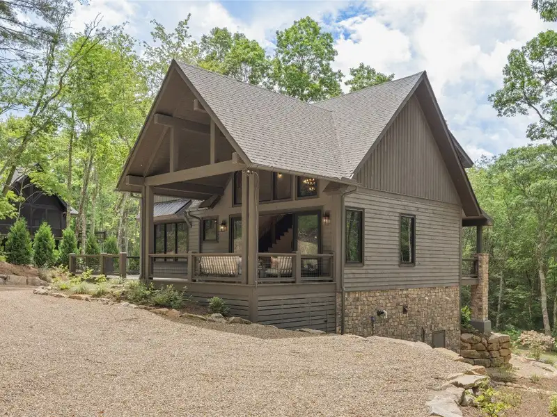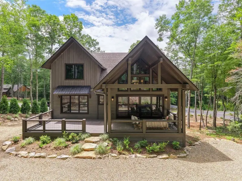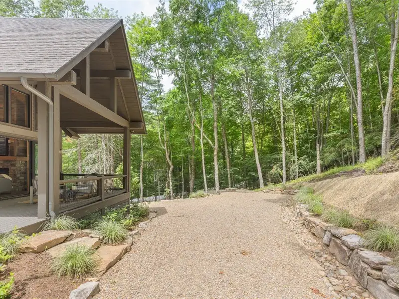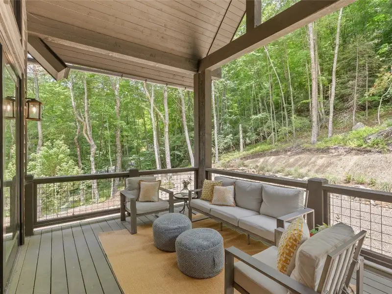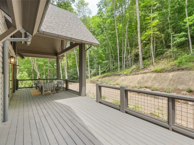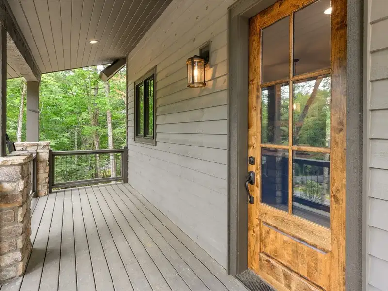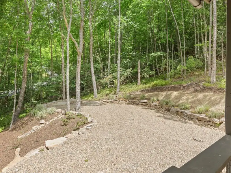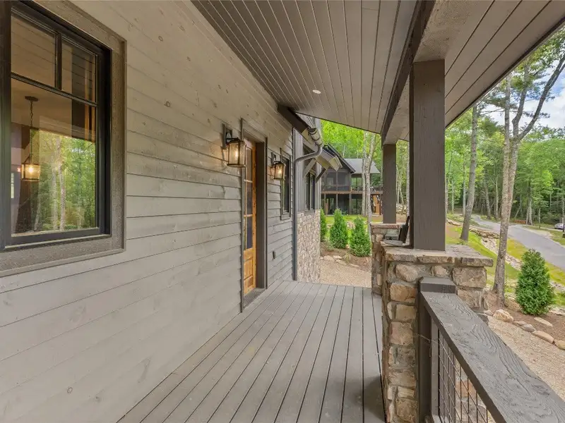 - Covered rear porch with lush landscaping