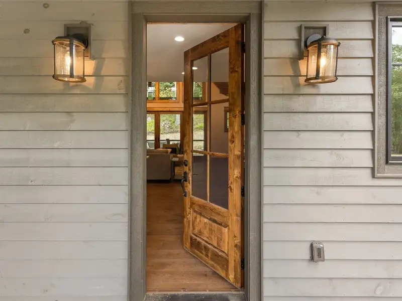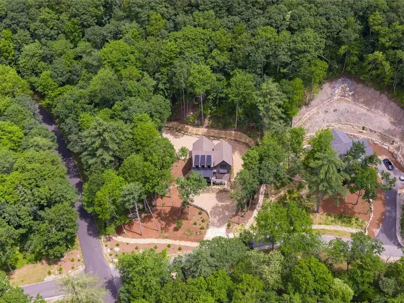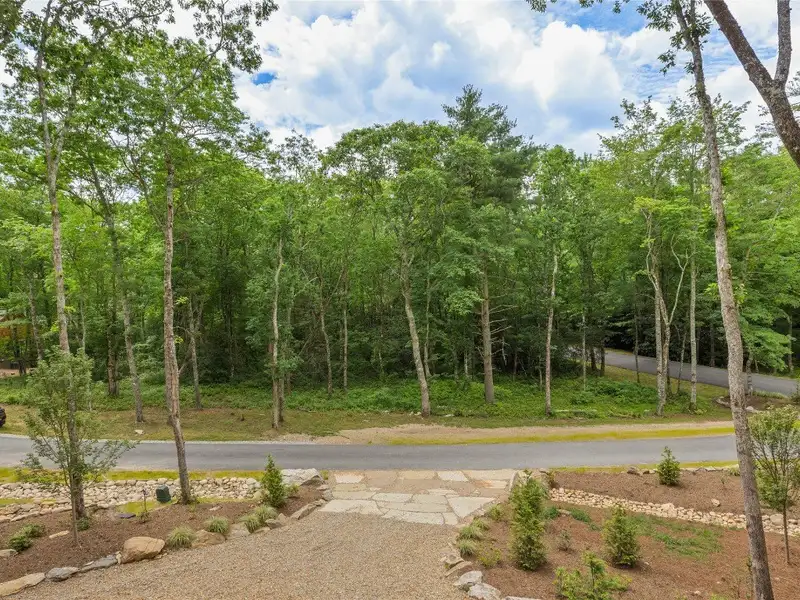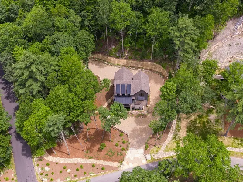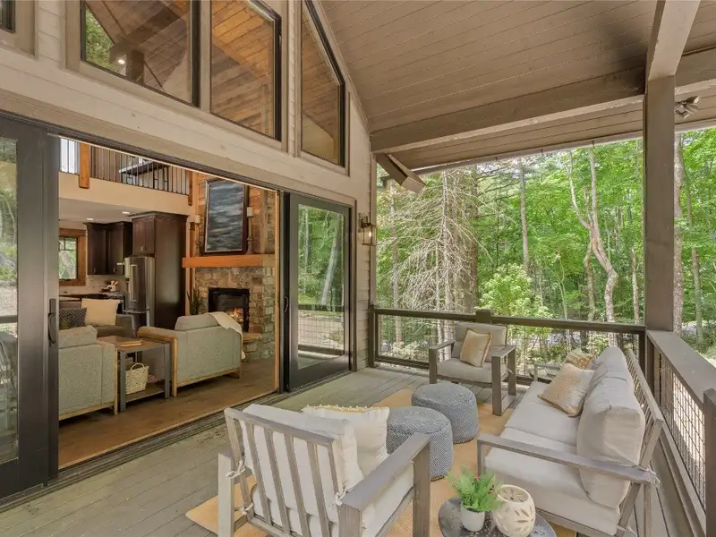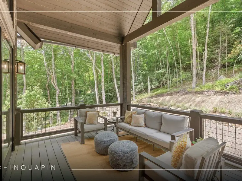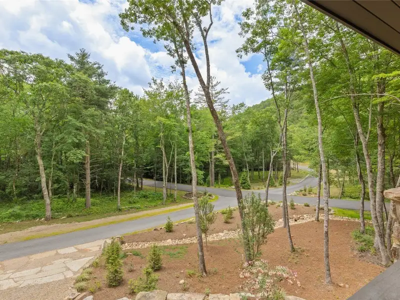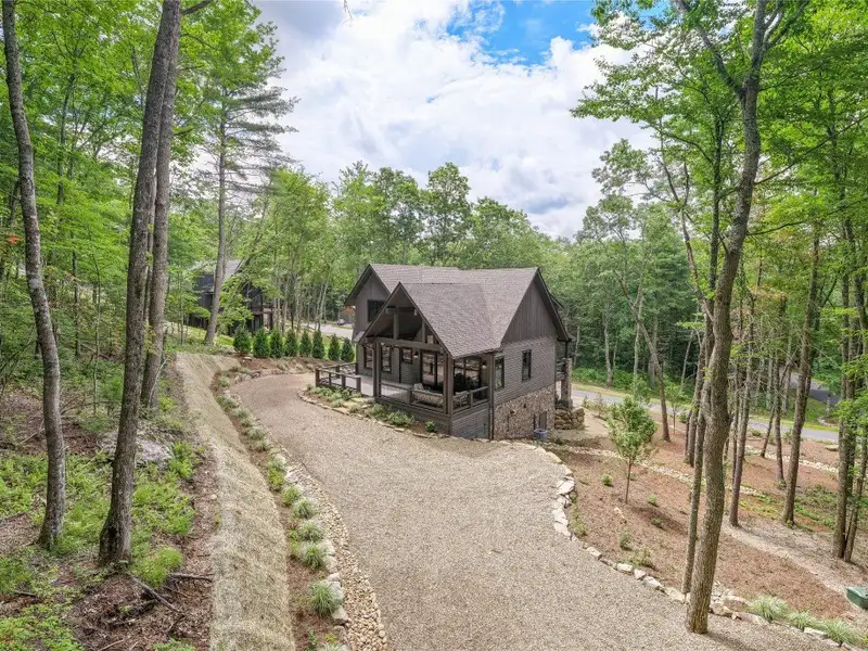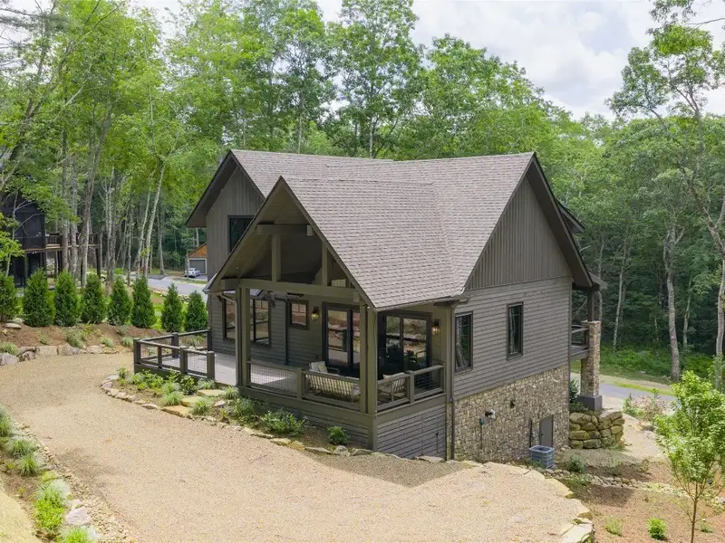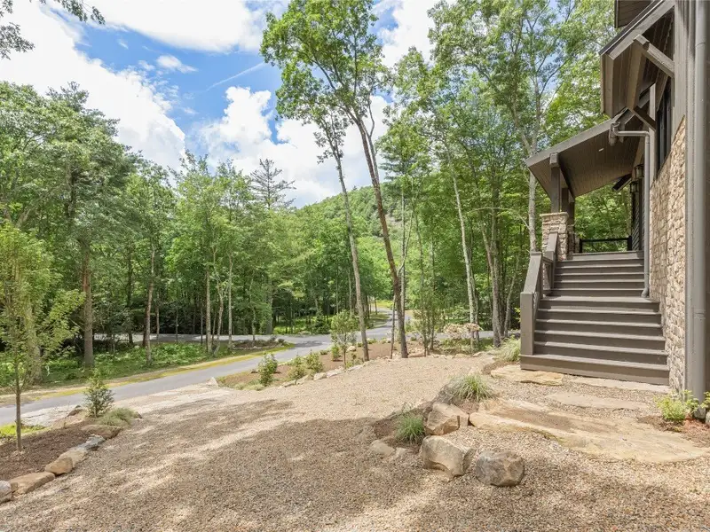 - Covered rear porch with lush landscaping