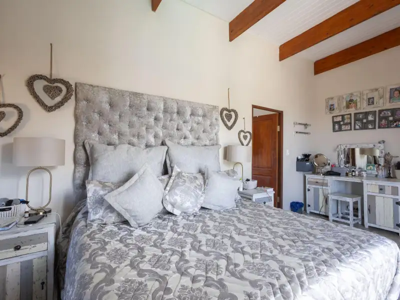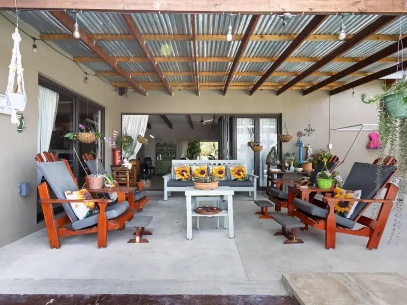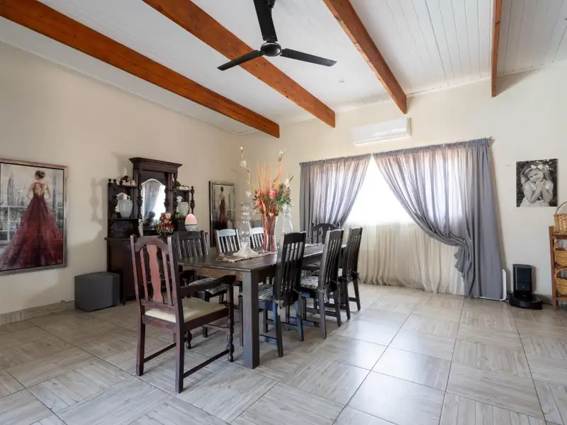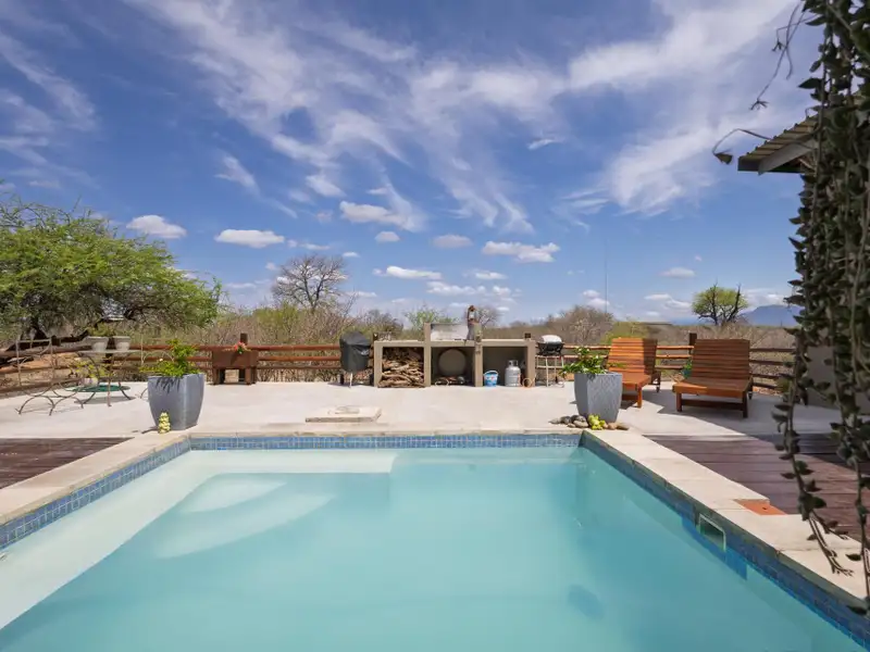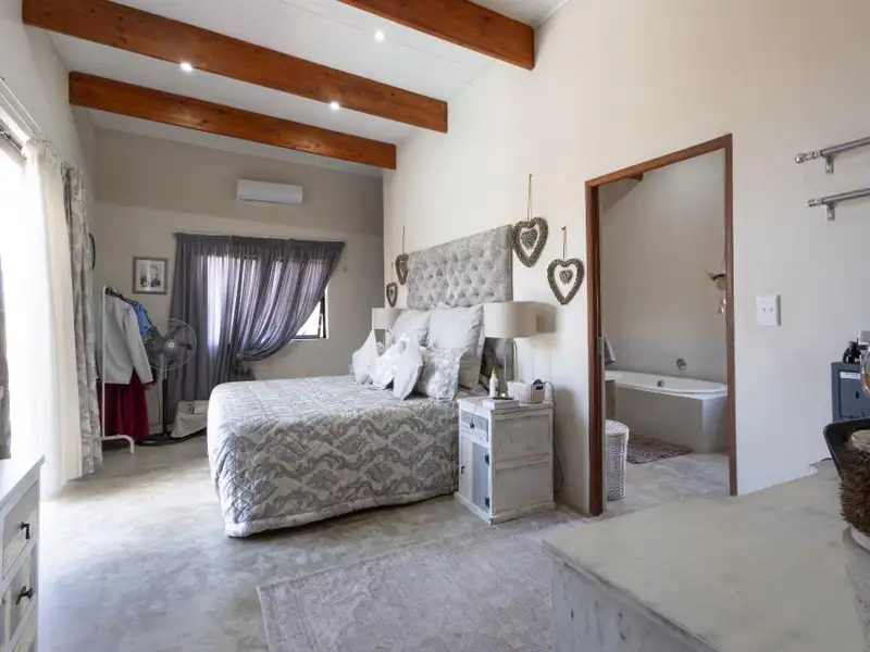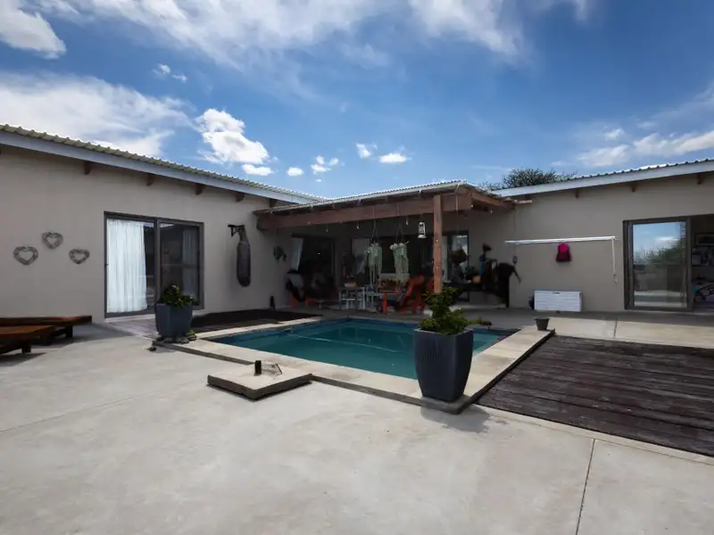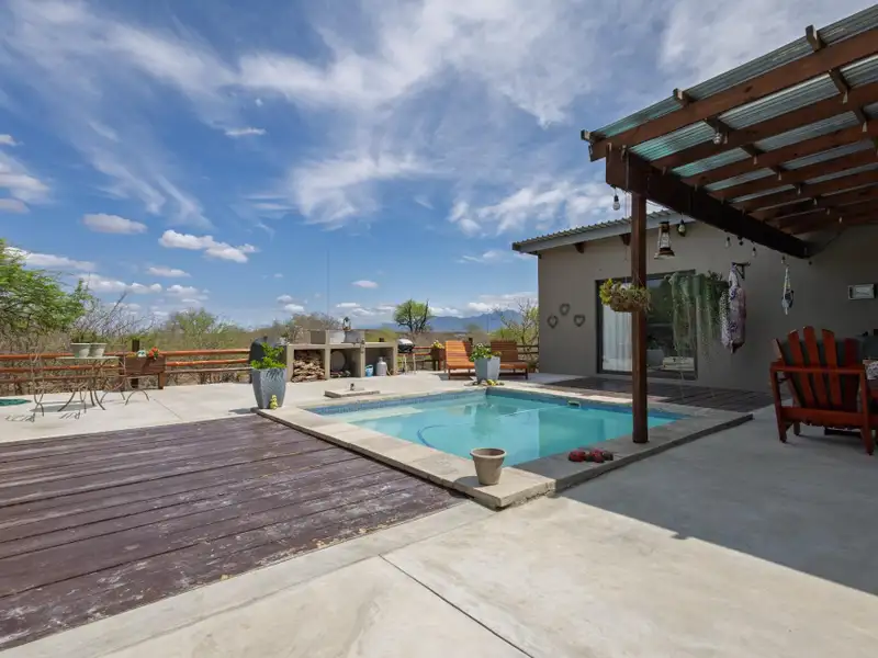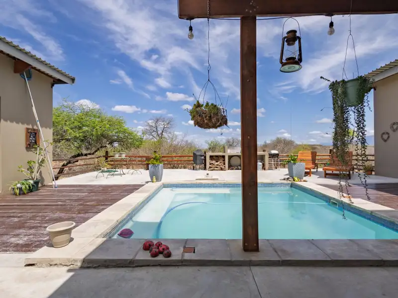 Enjoy seamless indoor-outdoor living on the covered patio, where you can unwind and take in panoramic views across the estate. The raised pool deck, finished in a stylish combination of screed and wood, includes a built-in braai/barbecue area ΓÇö the perfect setting for entertaining family and friends under the African sky.