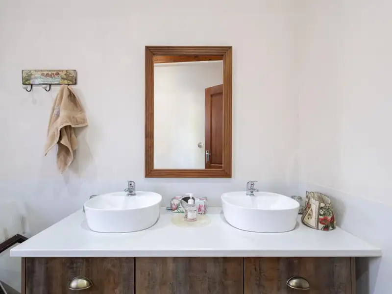 The enclosed garden, framed by natural latte fencing, is ideal for pet owners (two dogs permitted) and features a landscaped lawn, acacia trees, and a tranquil water feature.