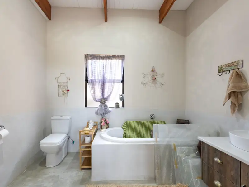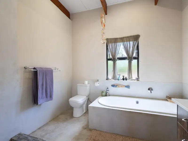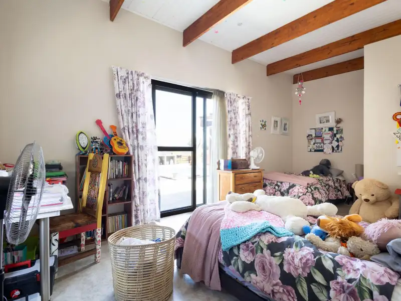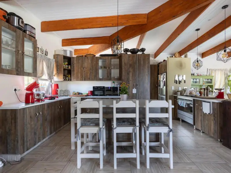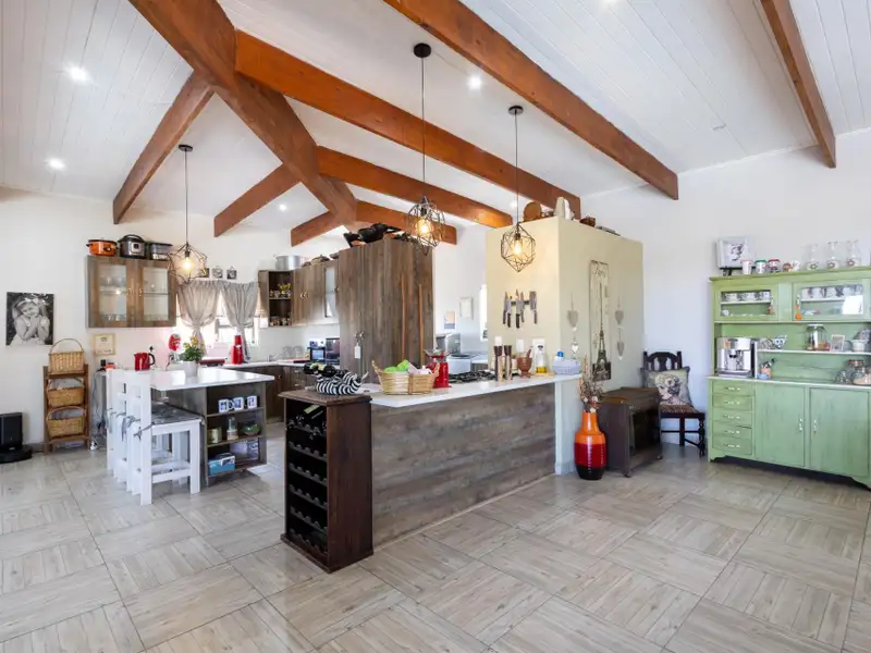 Step inside to discover a spacious open-plan living, dining, and kitchen area featuring high vaulted ceilings, exposed wooden beams, and cool screed flooring that enhance the homeΓÇÖs sense of space and light. A separate scullery provides convenience and functionality, keeping the main living area uncluttered.