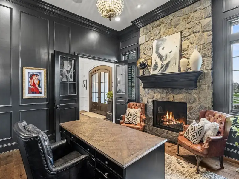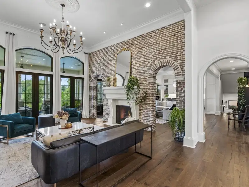 - Great room with limestone fireplace and French doors