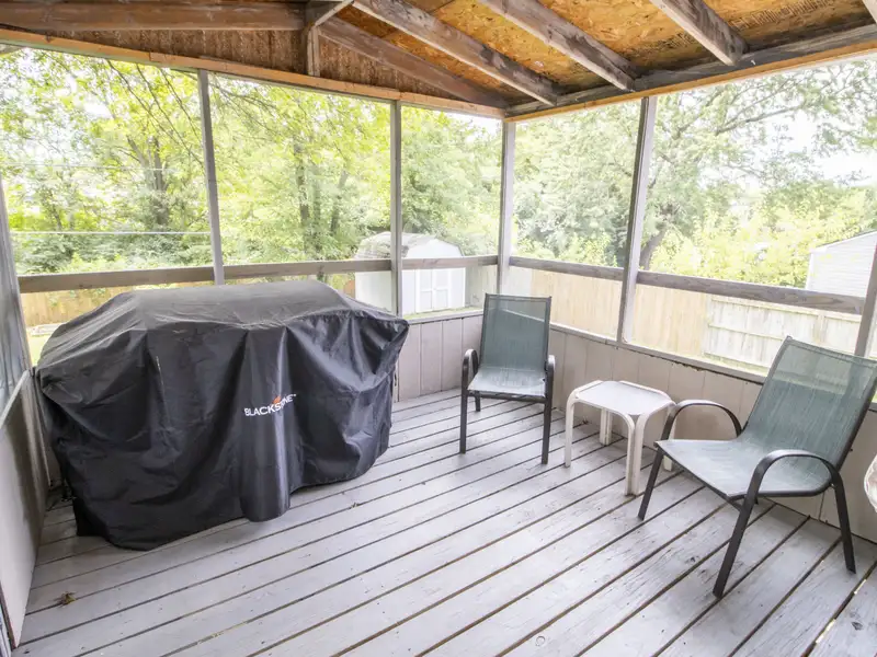 - Screened-in patio overlooking fenced yard