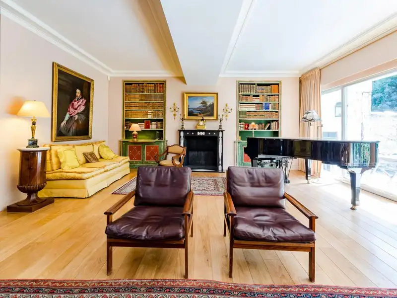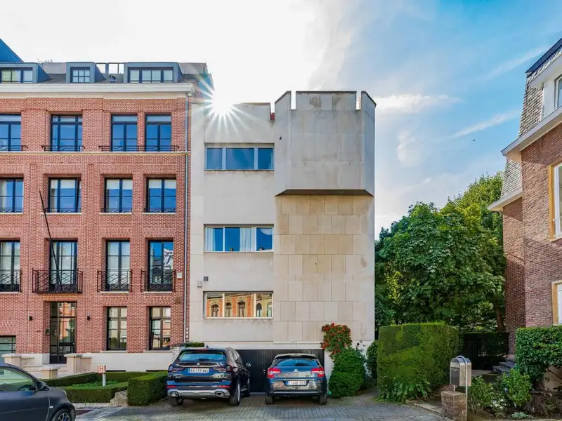 In the very exclusive Square du Bois, a beautiful house with character and a splendid south-facing garden designed by Jacques Wirtz, opening onto the Bois de la Cambre (plot of +/- 6 ares85). Living space of +/- 600 m² currently divided into two units: a duplex garden level of 400 m² and a duplex penthouse of 200 m² enjoying a beautiful panoramic terrace. Service flat (2 bedrooms, bathroom). Lift. Garage for 2 cars. PEB D