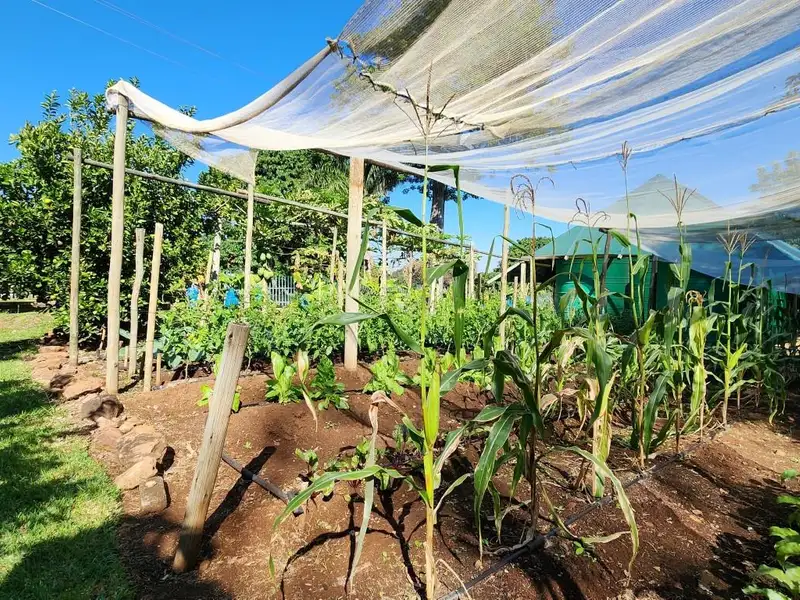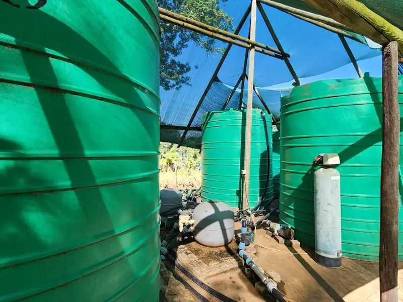 Step outside and discover your own private paradise. Three sparkling fish ponds teeming with life add a touch of whimsy, while a 60,000-liter JoJo tanks, complete with pumps and filters, ensures a constant supply of water for your verdant oasis. Three garages provide ample storage, while a sparkling pool beckons refreshing dips on warm summer days.