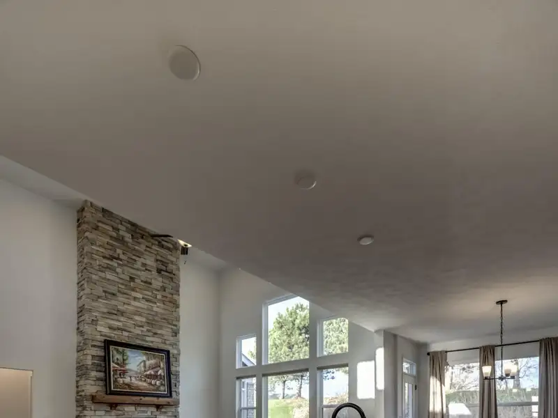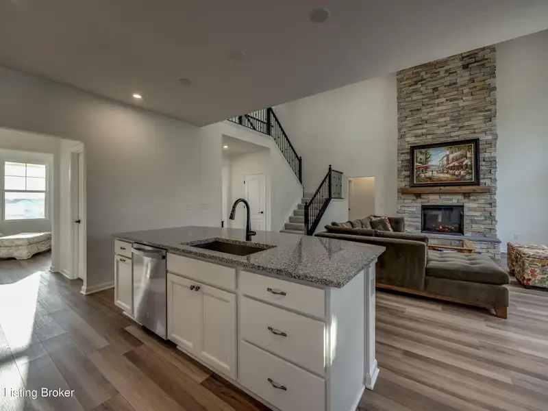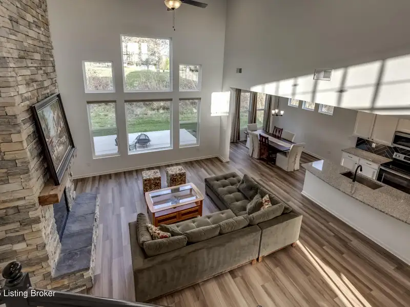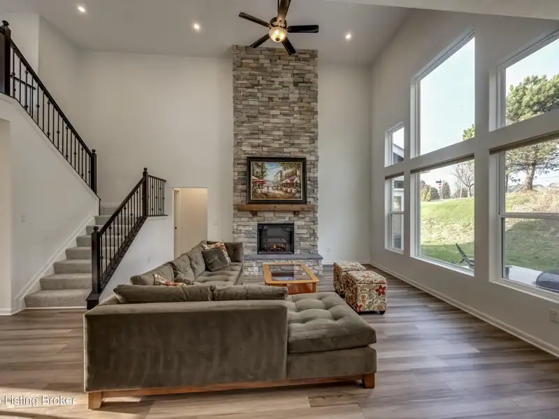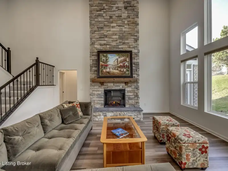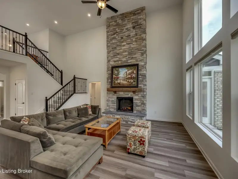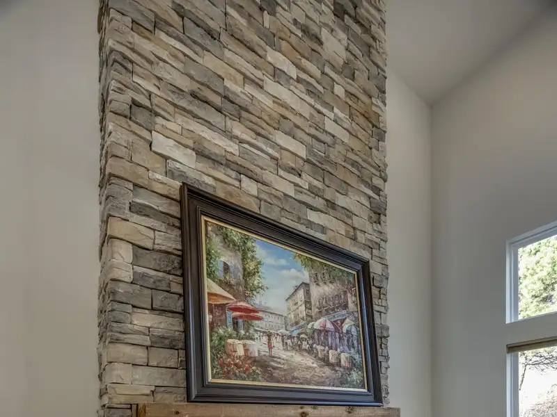 - Two-story great room with stacked-stone fireplace