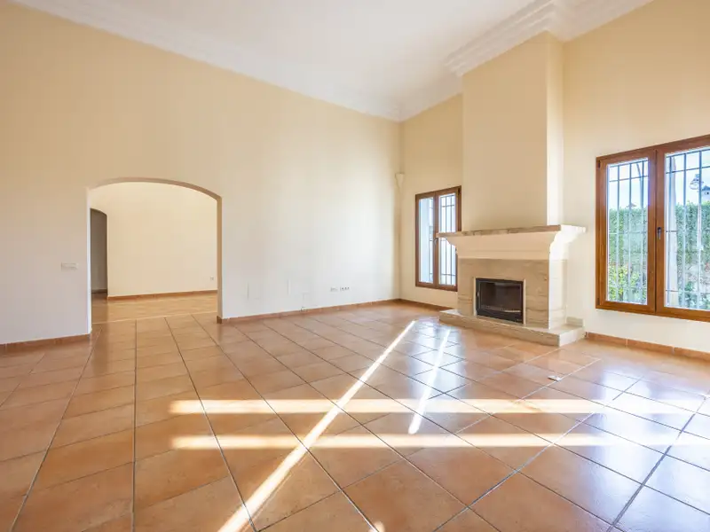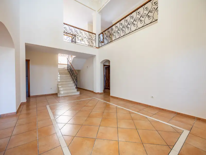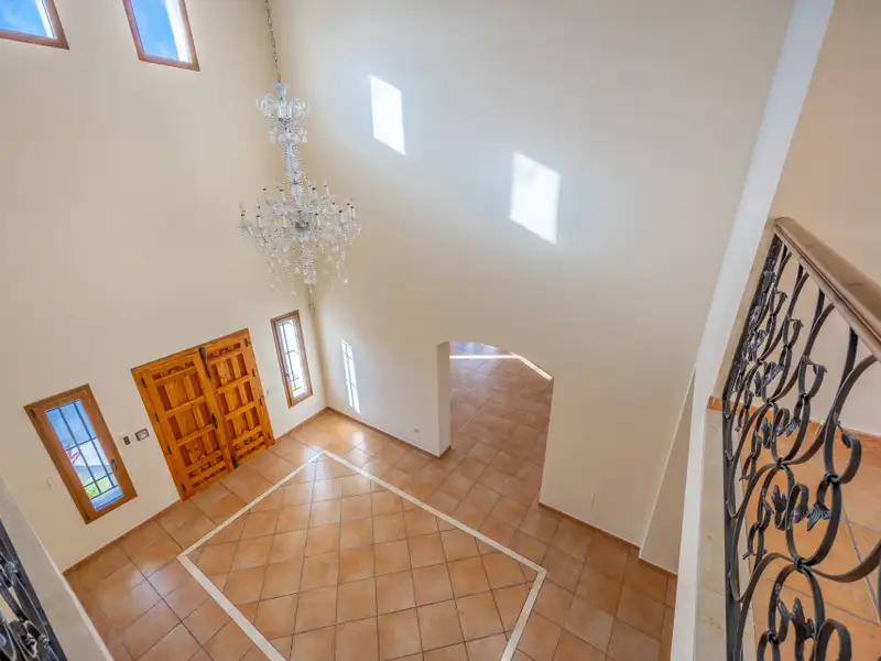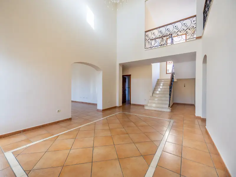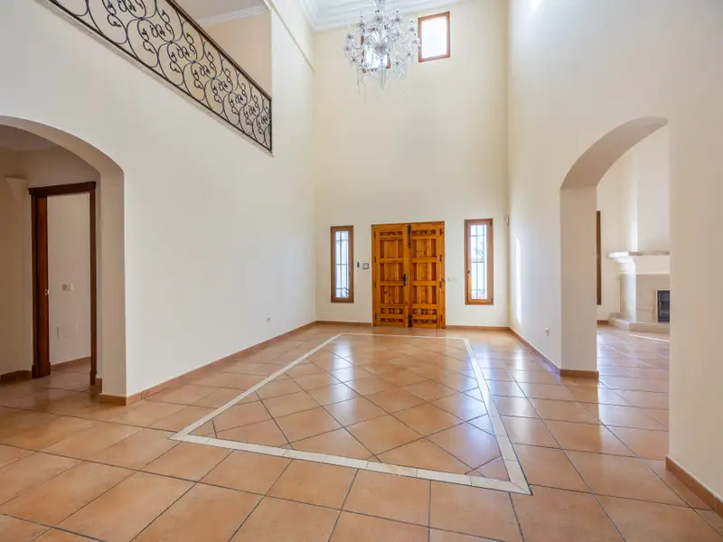 The villa, distributed over two floors, boasts three bedrooms—two on the ground floor and a suite on the first floor—and a total of four bathrooms (one of them by the pool), providing generous and functional living space. On the main floor, a stylish double-height entrance hall welcomes you, enhanced by an impressive chandelier and high ceilings. On one side, there are two bedrooms with built-in wardrobes and two bathrooms, one of them en-suite, offering privacy and comfort. On the other side, you’ll find a spacious living room with a fireplace, a separate dining room that could be converted into a playroom or study, connected to a fully equipped kitchen with an adjoining laundry area. On the upper floor, there is a third bedroom with an adjacent bathroom, ideal as a master or guest room.