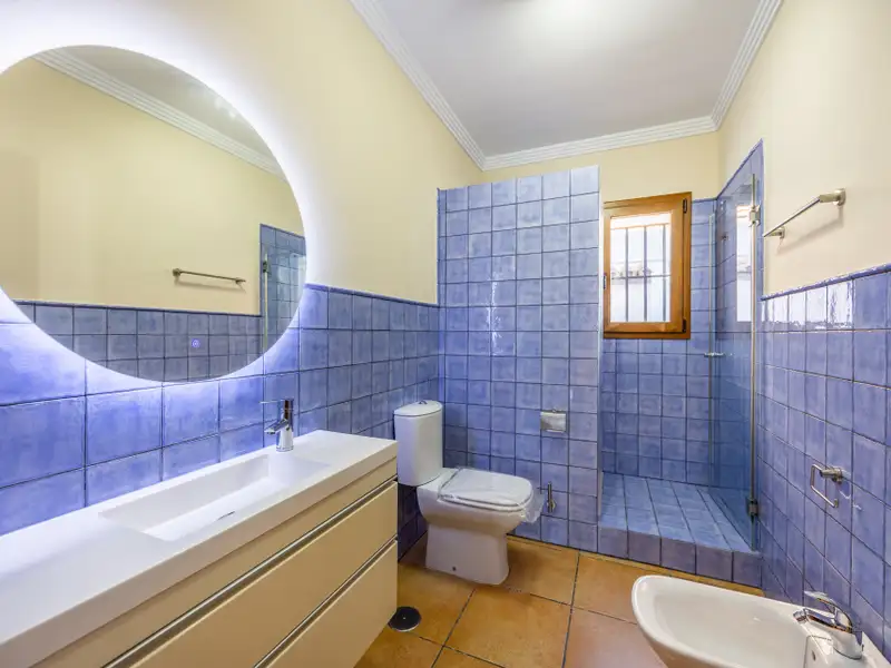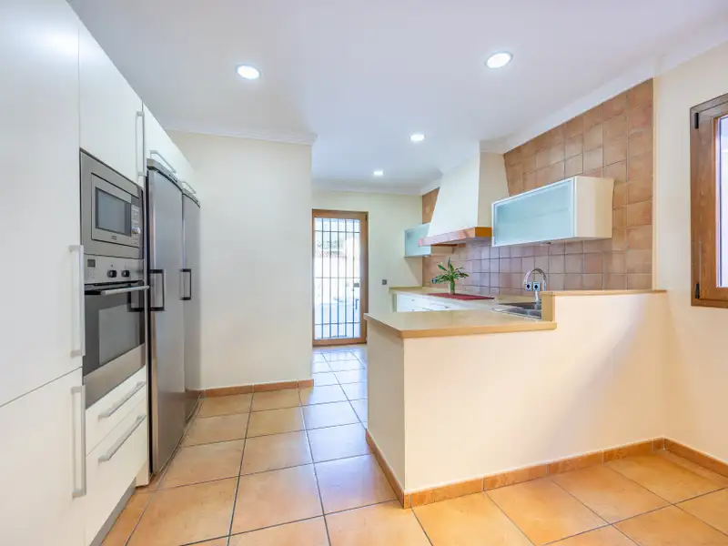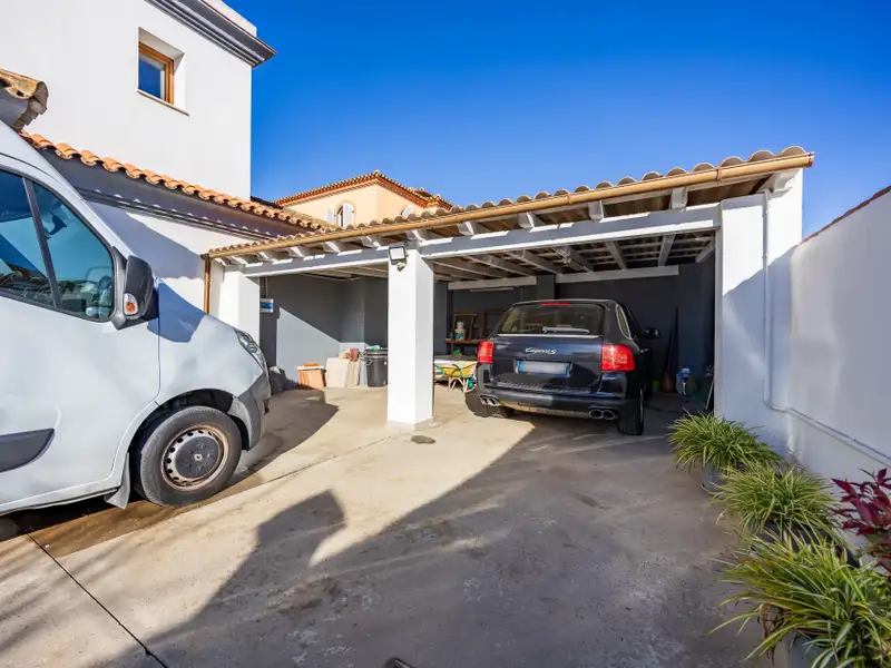 The exterior of the property is equally impressive, featuring a well-maintained and recently renovated private garden surrounding a 46 m² swimming pool. The covered porch area invites you to enjoy the Mediterranean climate year-round, while a practical laundry area, storage room, and an additional bathroom by the pool add to the outdoor functionality. The property also offers a parking area, including covered space for two vehicles and uncovered space for two more—perfect for families with multiple transportation needs.