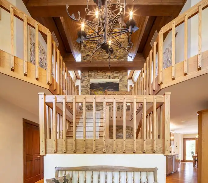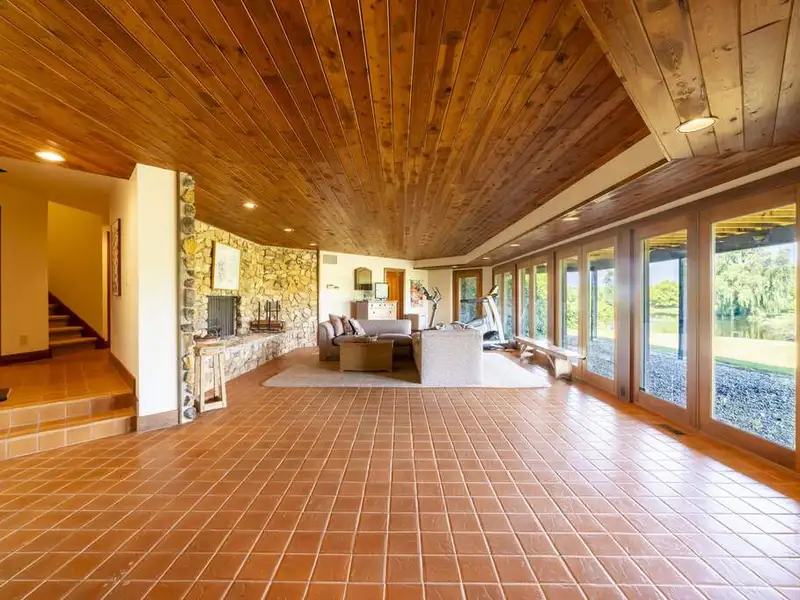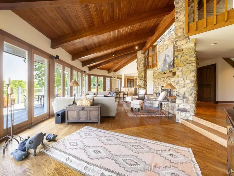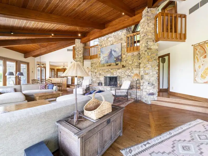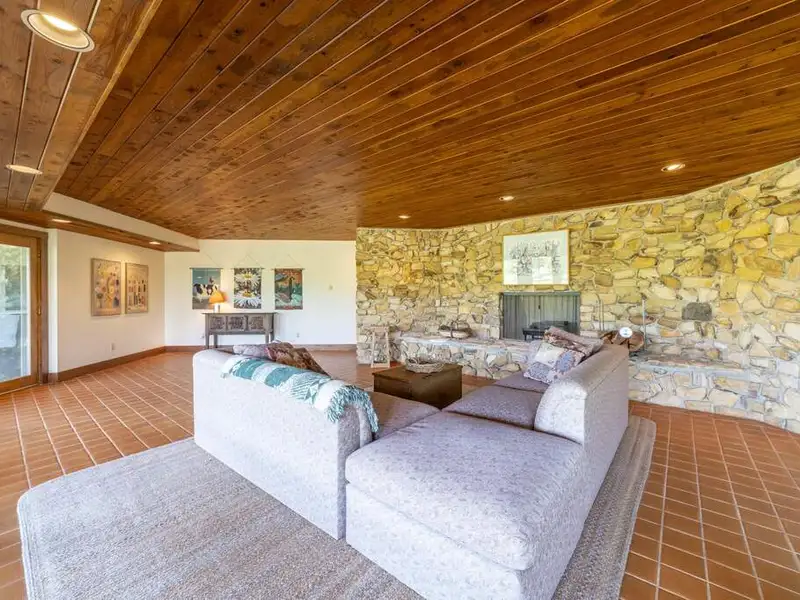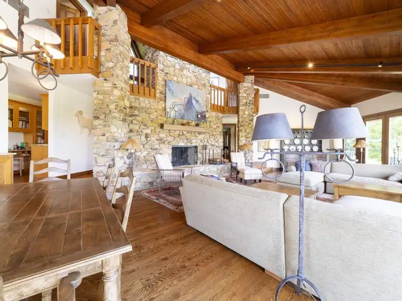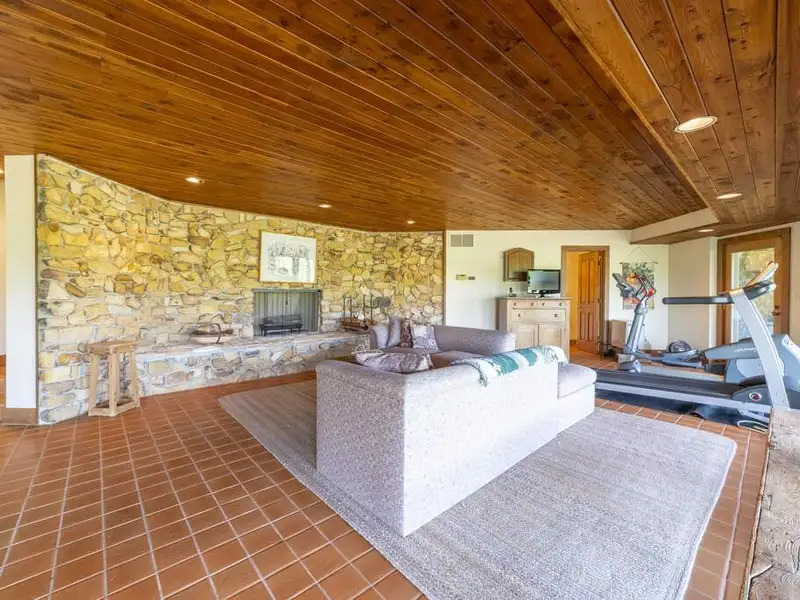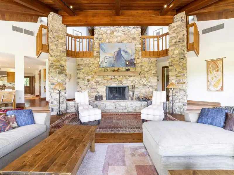 - Floor-to-ceiling stone fireplace in living area