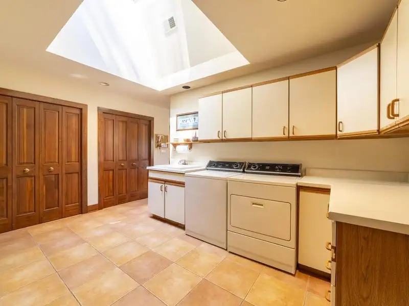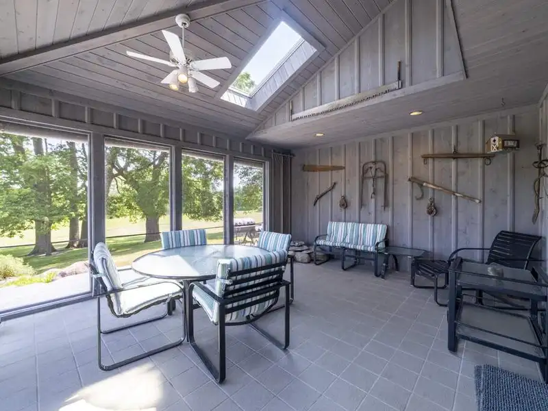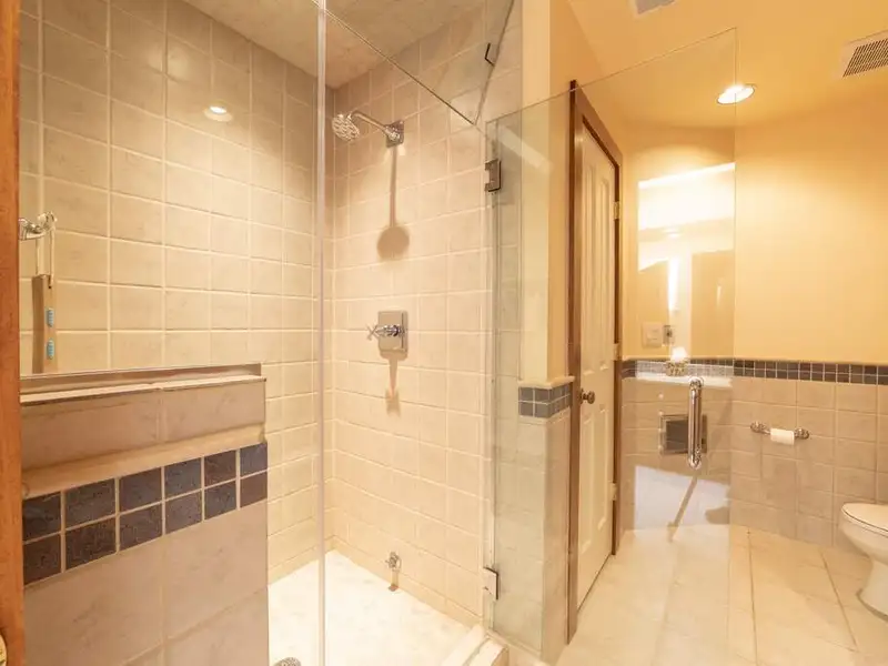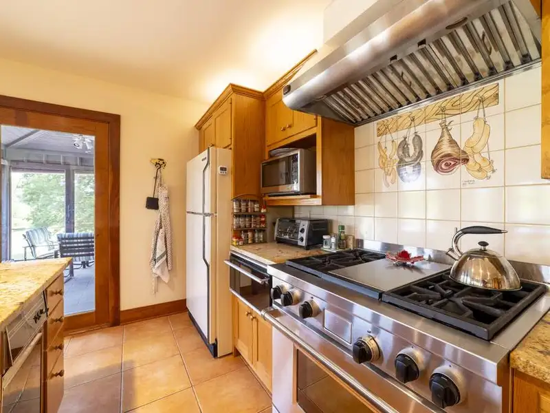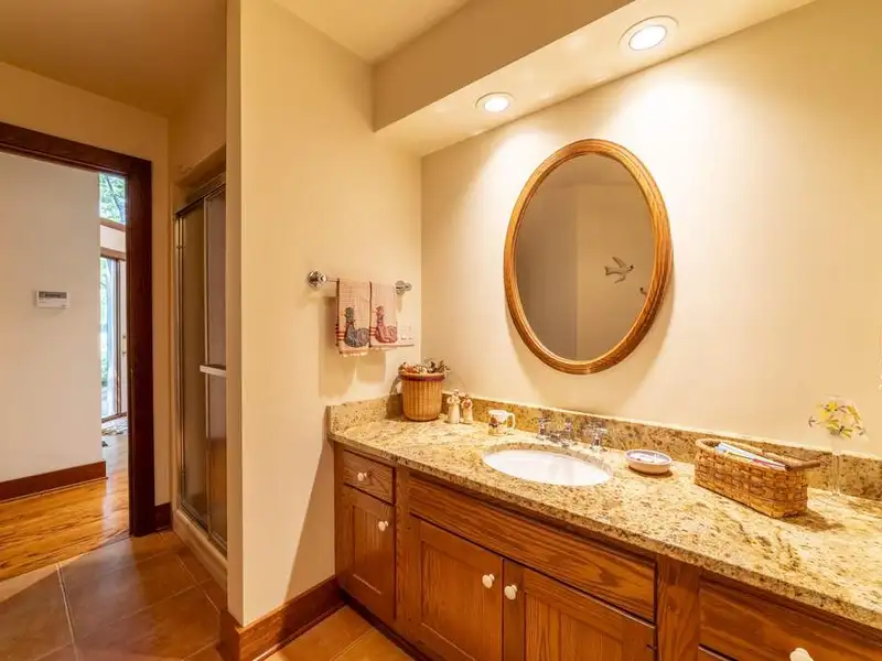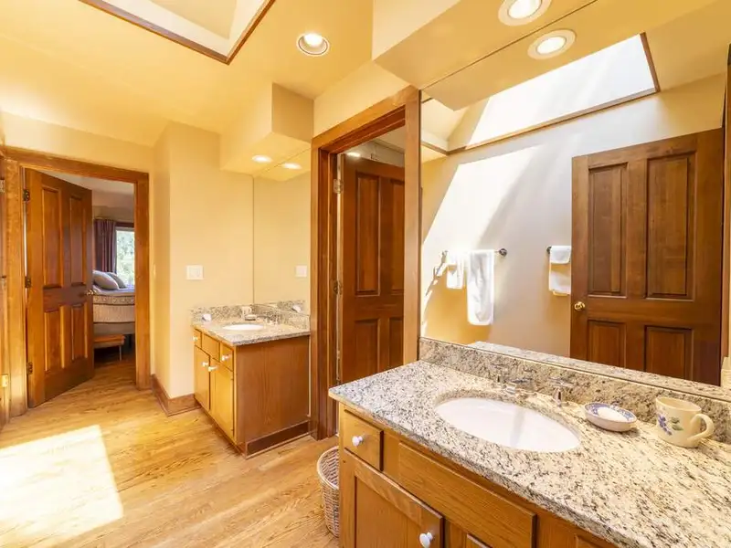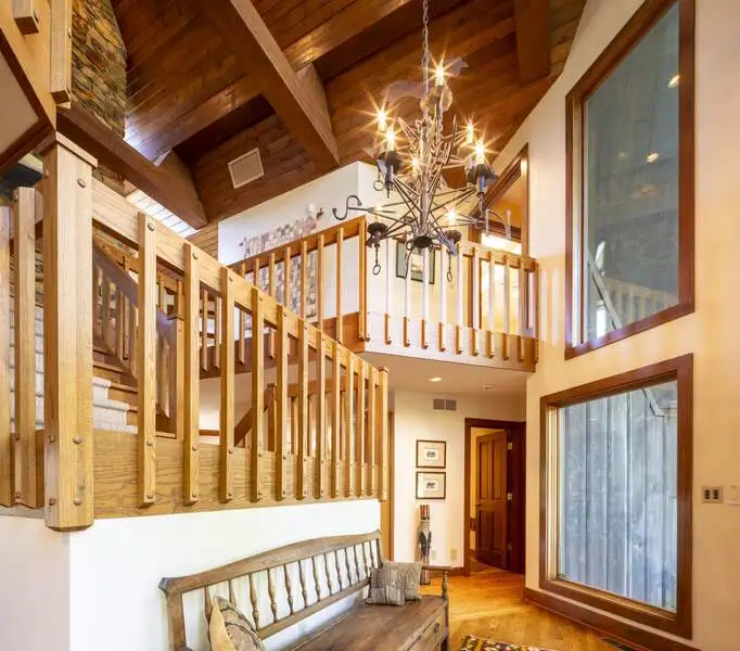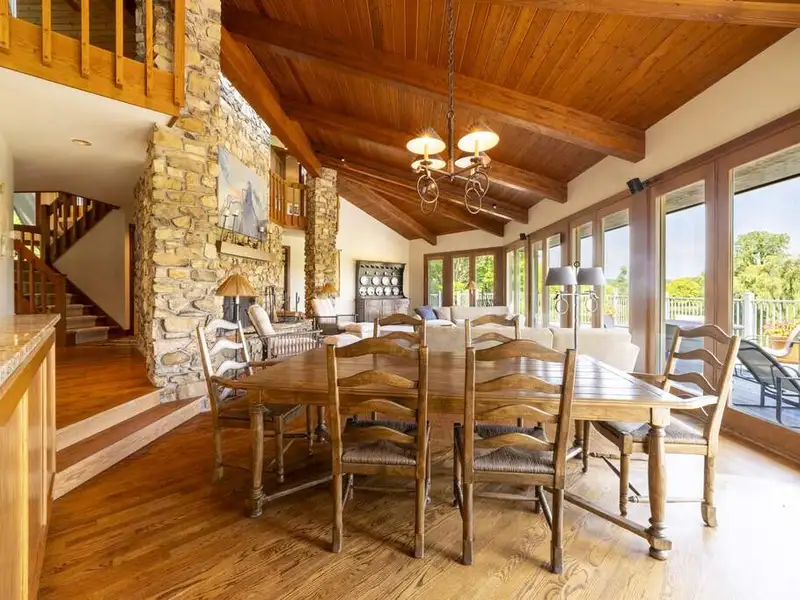 - Floor-to-ceiling stone fireplace in living area