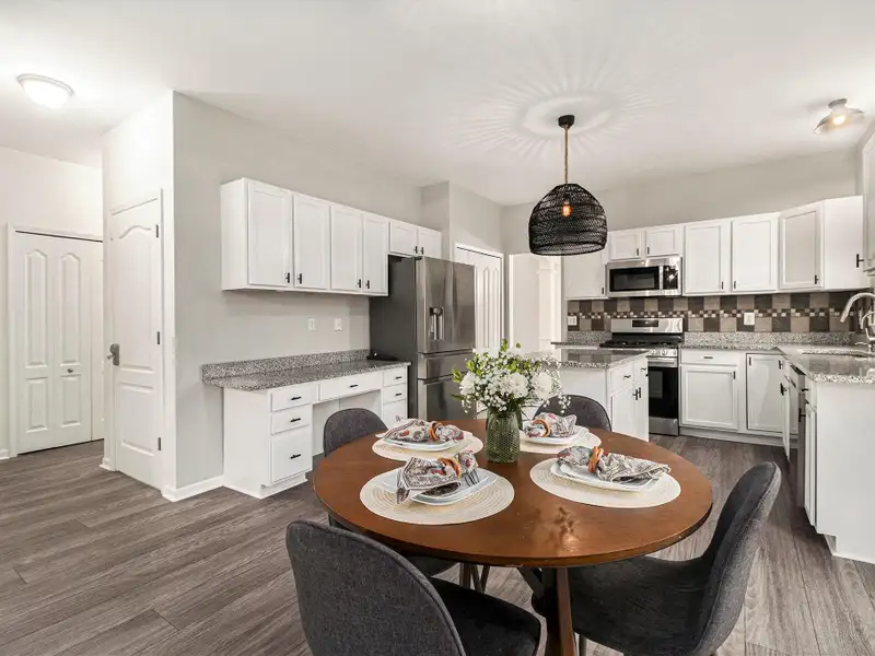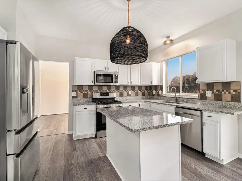 - Kitchen with granite countertops and tile backsplash