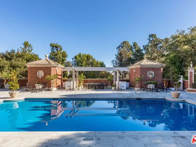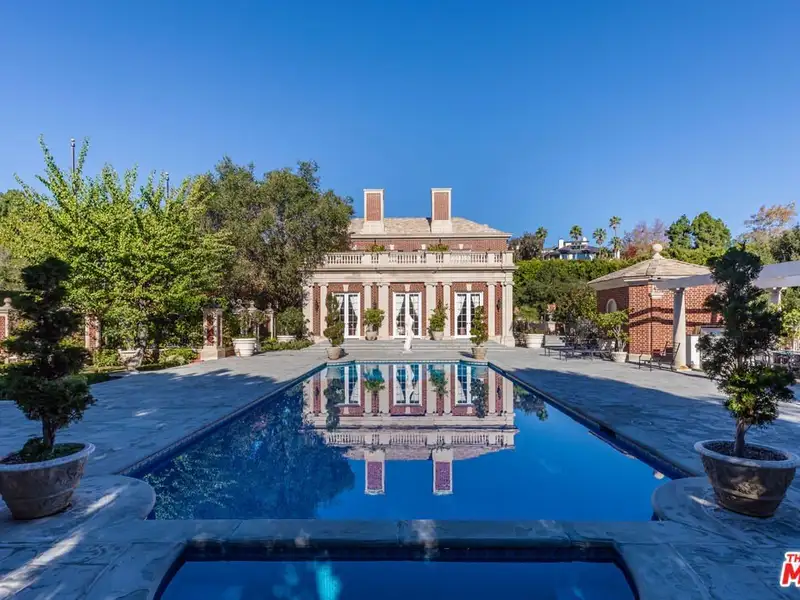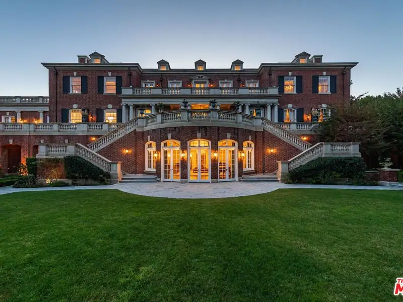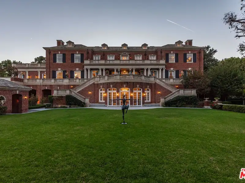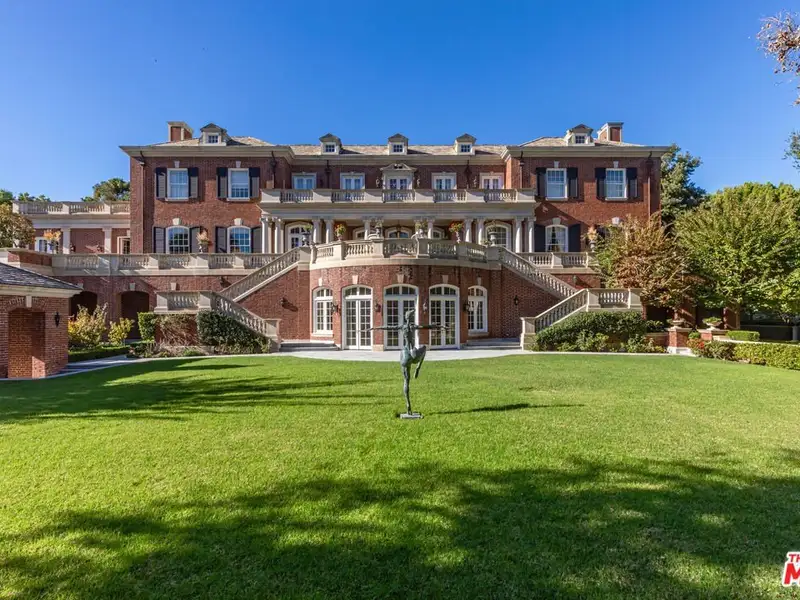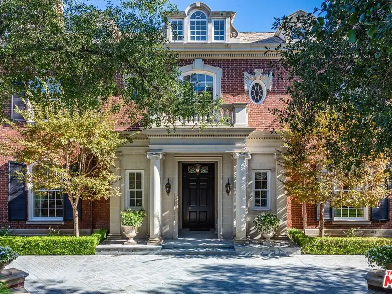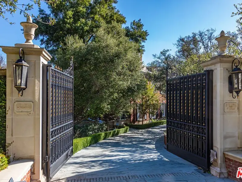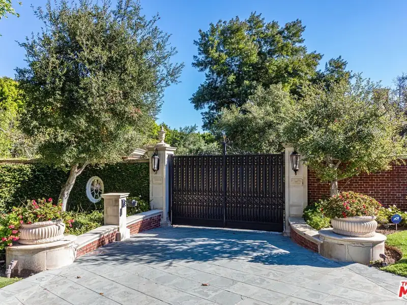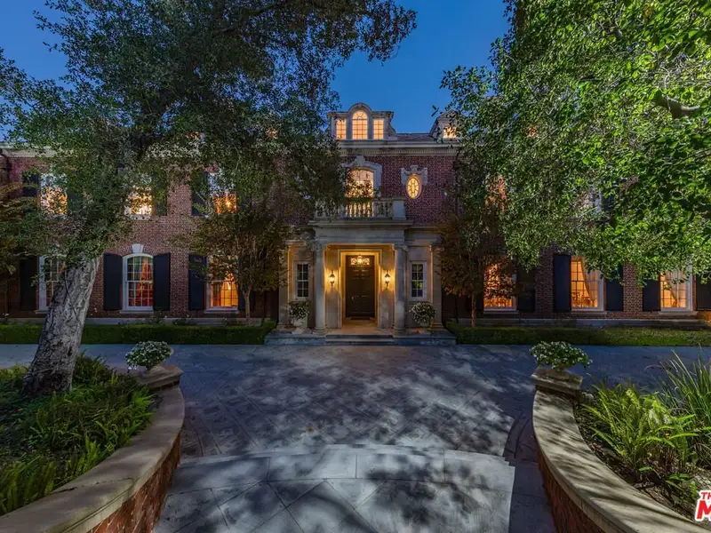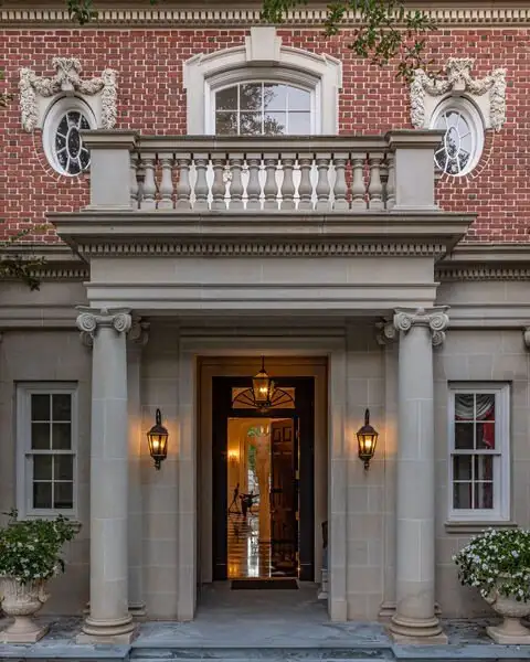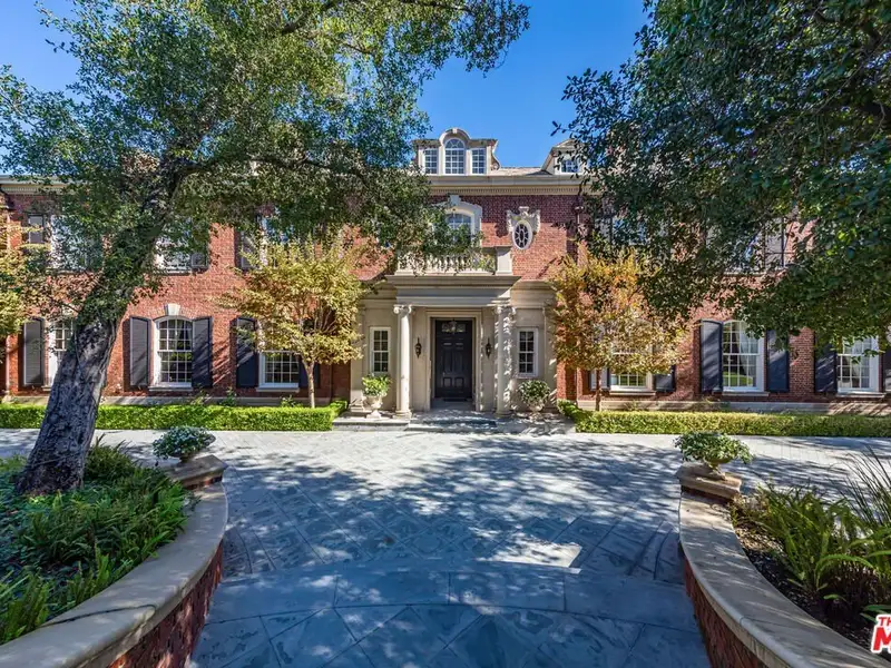 - Gated circular drive with red-brick exterior