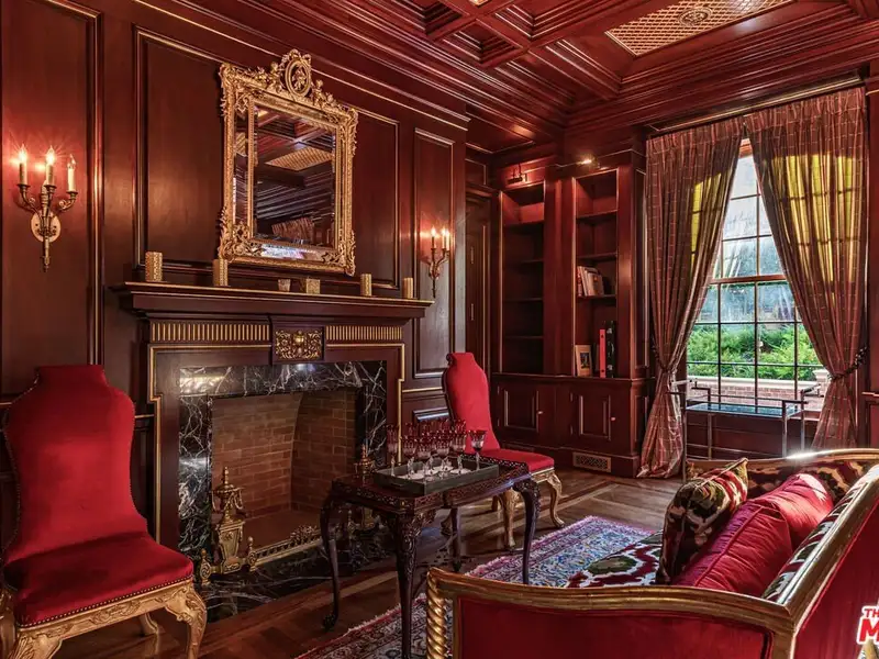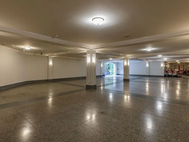 - Lower level with oak-paneled ballroom, stage