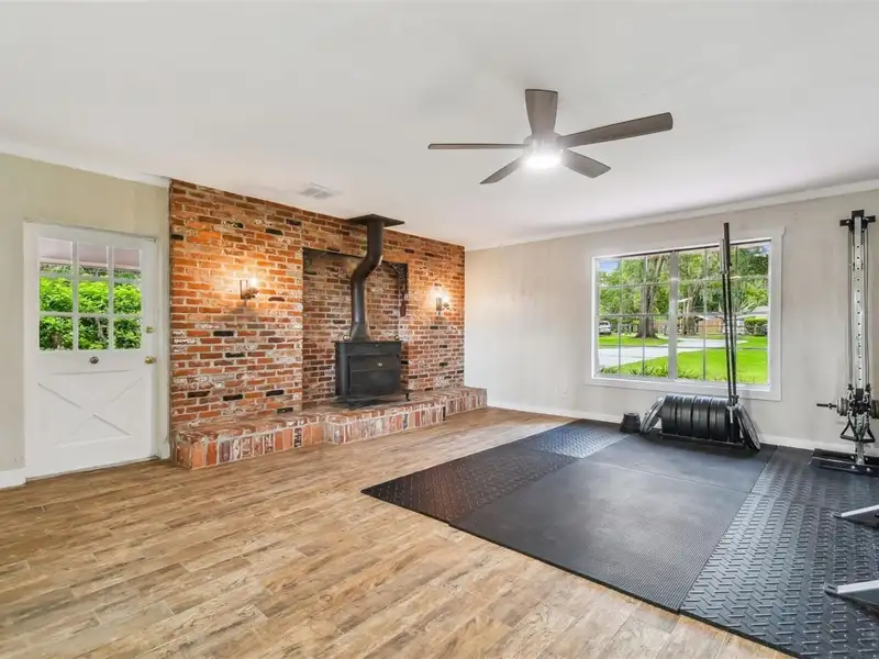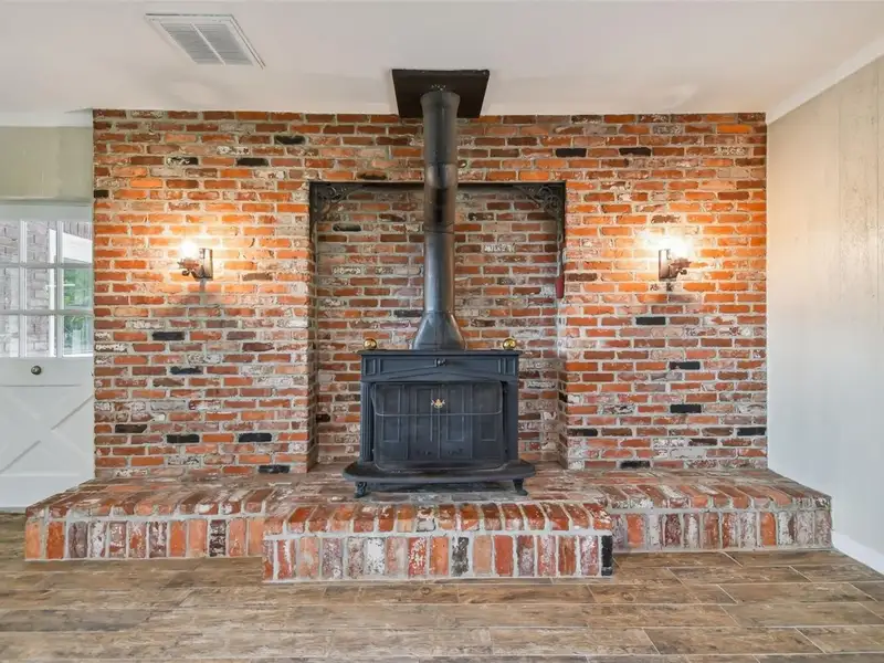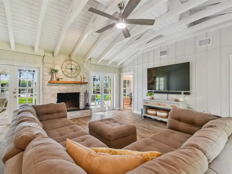 - Wood-burning fireplace with exposed beams