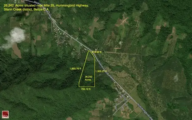 Nestled in the heart of the lush Hummingbird Hills, this stunning 26.24-acre property offers a rare opportunity to own a piece of paradise along the scenic mile 25 of the Hummingbird Highway in the Stann Creek District. With 618.54 feet of highway frontage and elevated well above the road, this property provides both convenience and serenity, offering unmatched privacy and spectacular views of the Stann Creek Valley and surrounding hills.One of the most striking features of this land is its dramatic elevation changes. Rising over 500 feet from the highway to the hilltops at the southern edge of the property, the land reaches impressive heights of more than 900 feet above sea level. This commanding elevation not only provides a natural vantage point for stunning, panoramic views but also ensures cool breezes and a sense of seclusion, all while being enveloped in the beauty of the surrounding tropical rainforest.Imagine waking up to the soft glow of sunrise over the valley, the lush tropical rainforest surrounding you, and ending your day with breathtaking sunsets painting the sky in vivid colors. The property features multiple cleared homesites, including a primary homesite that is ready to build, making it easy to turn your vision of a dream home or eco-retreat into a reality. The elevation of the land ensures you’re well above any flooding concerns while enjoying a cool, refreshing mountain breeze.Located just south of Middlesex Village and only 30 minutes from the capital city of Belmopan, this land strikes the perfect balance between seclusion and accessibility. The property is part of an approved subdivision, offering a wealth of development potential, whether you’re planning to build your own private sanctuary or create an investment opportunity in one of Belize’s most sought-after areas.With its lush rainforest, stunning valley views, and serene environment, this property is a true gem. Whether you envision a peaceful retreat, an adventure-filled weekend getaway, or a home surrounded by nature, this slice of paradise is ready to become your haven. Don’t miss the chance to own this unique and captivating property along the Hummingbird Highway, where nature meets tranquility in perfect harmony.