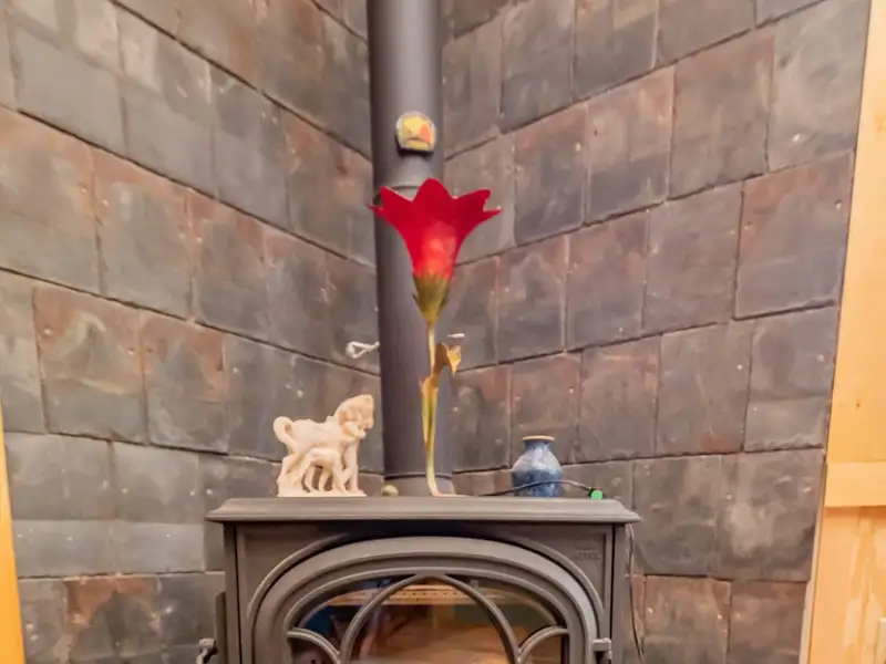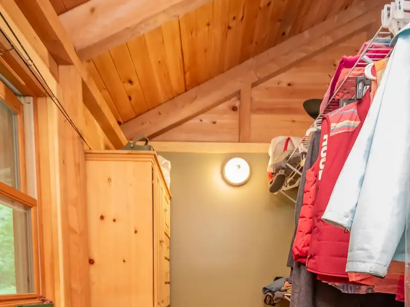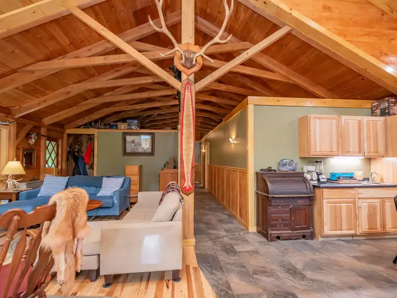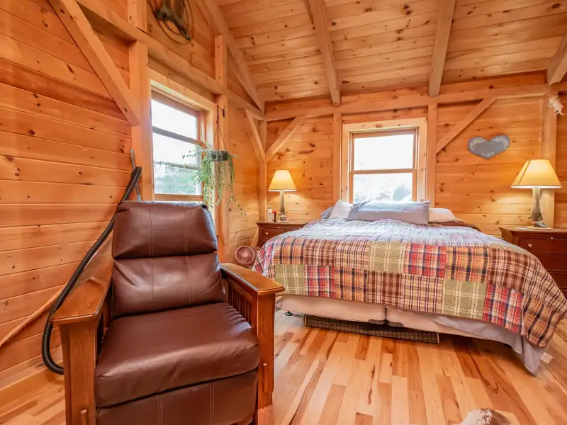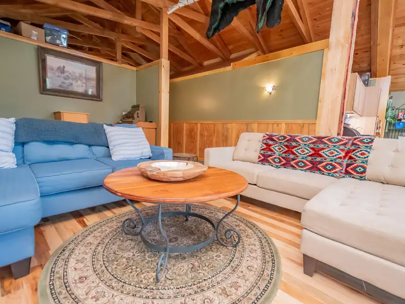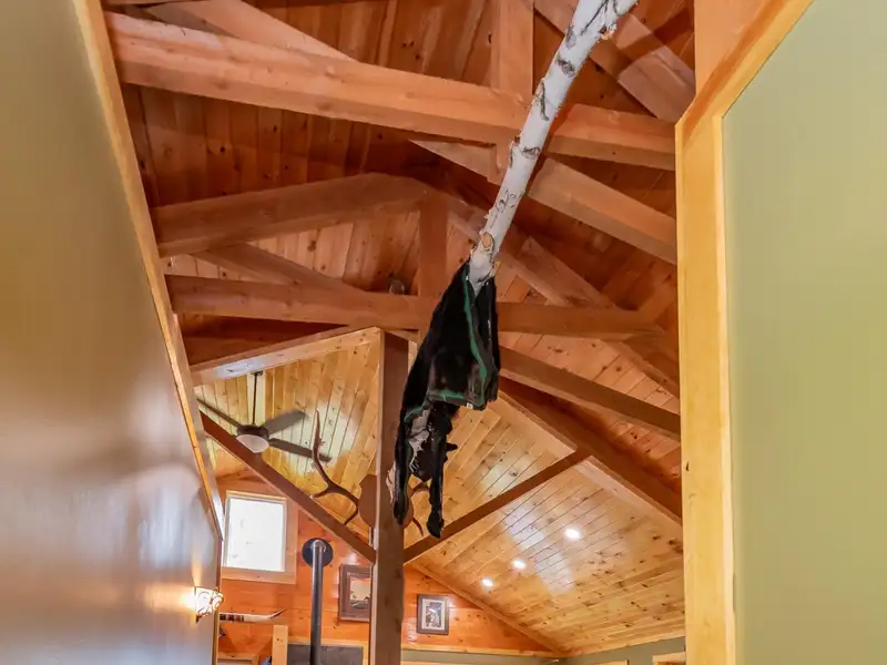 - Vaulted ceilings with exposed beams and hardwood floors