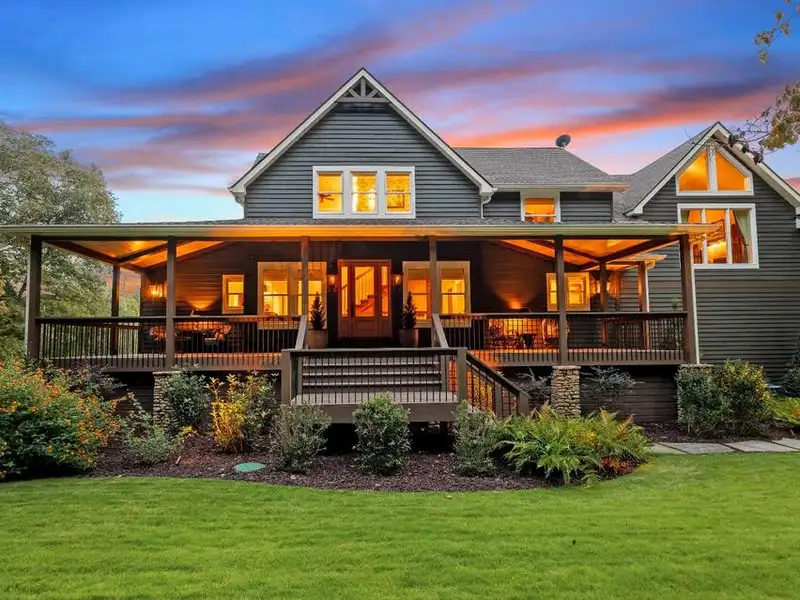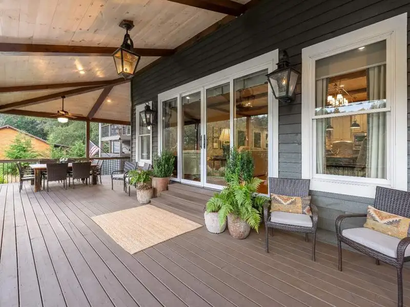 - Large covered porches and riverfront deck