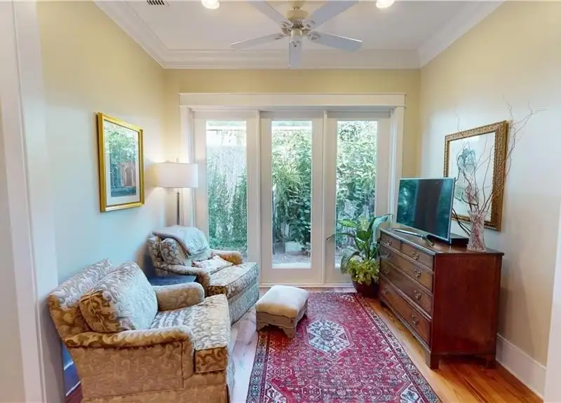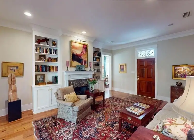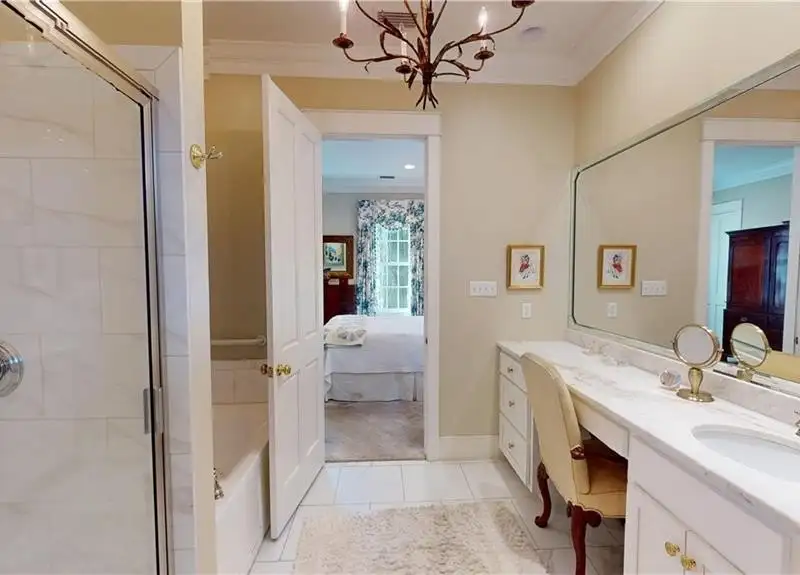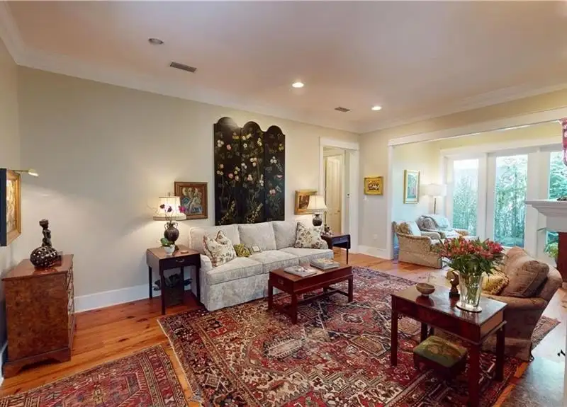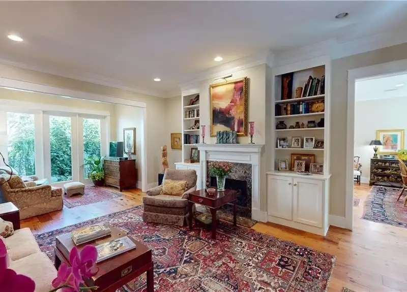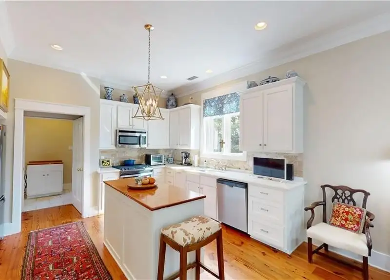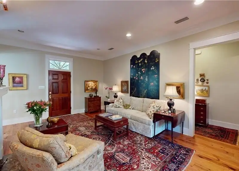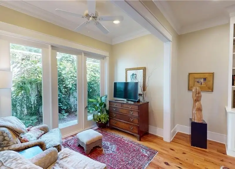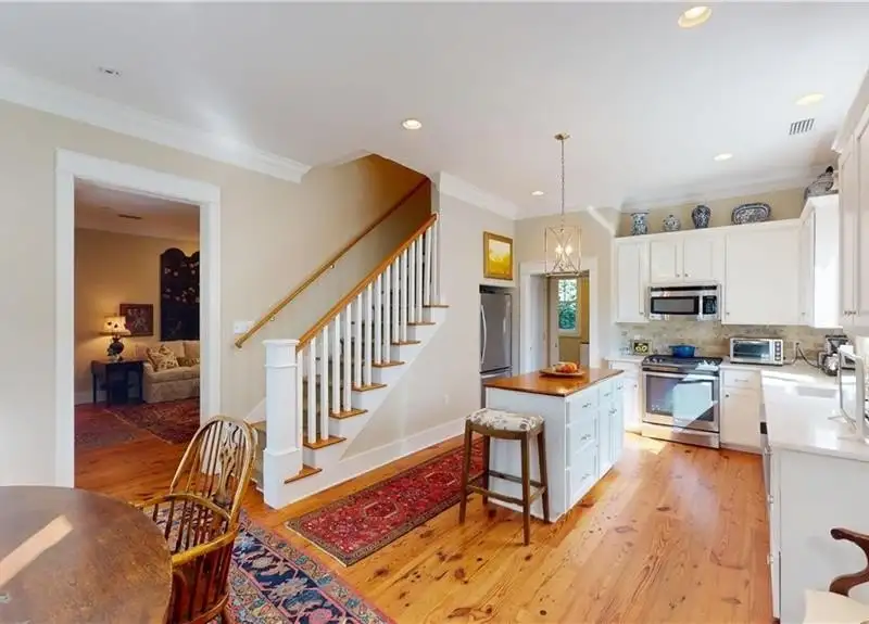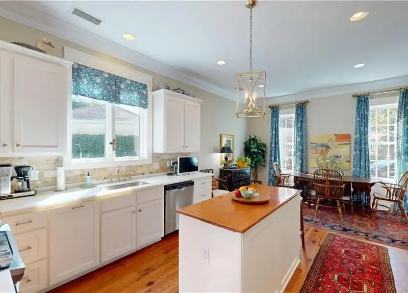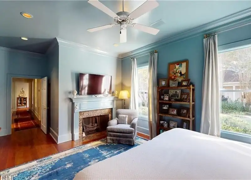 The guest house, built in 2016, is equally impressive. With a Federal-style design and concrete board exterior, it offers 10-foot ceilings, heart pine floors, and a gas log fireplace. Built on a slab foundation, the home is as solid as it is charming. Sunlight pours through the large picture window, creating a welcoming atmosphere.