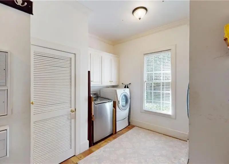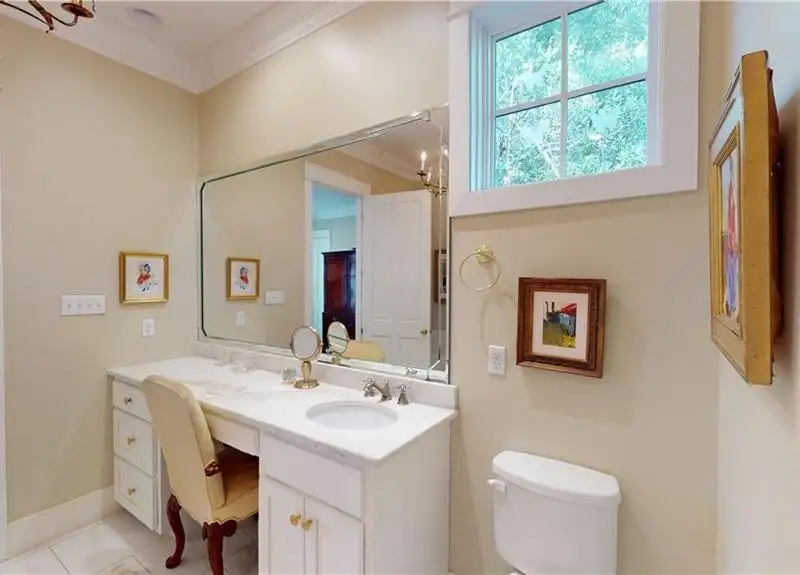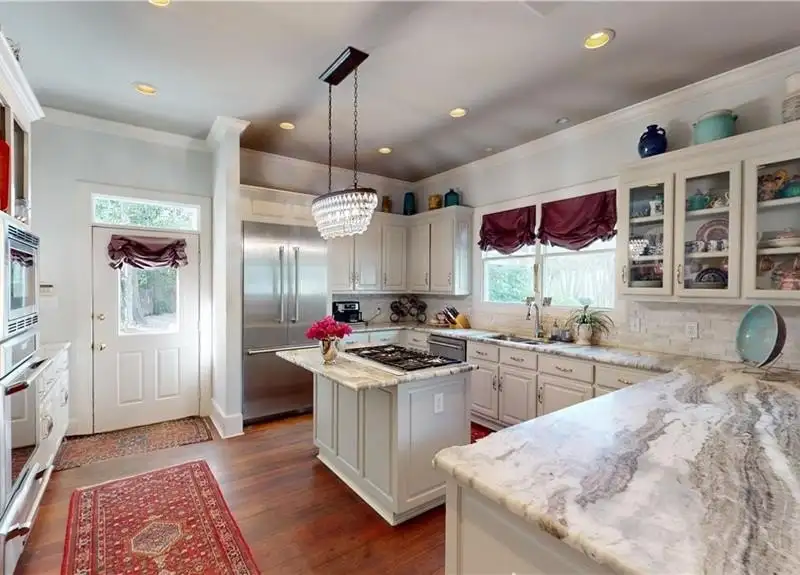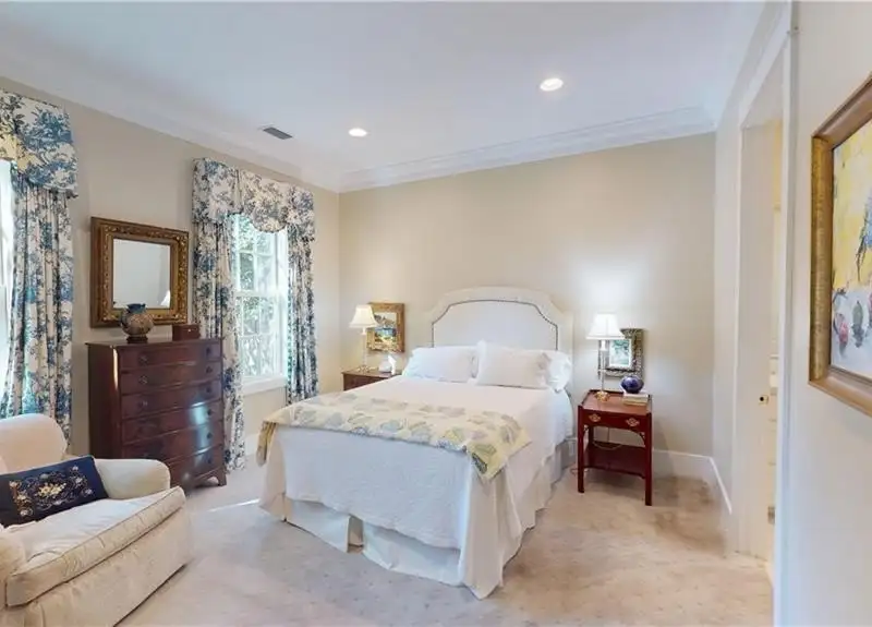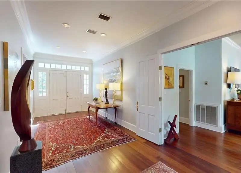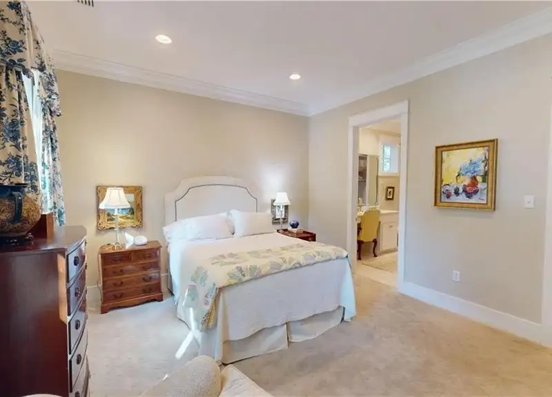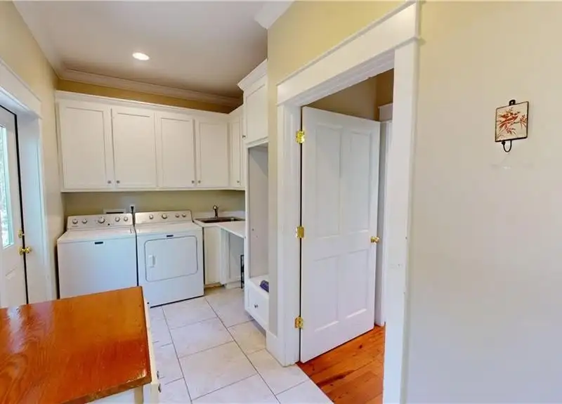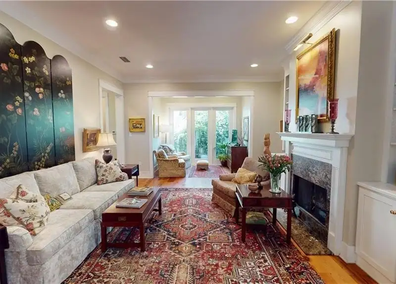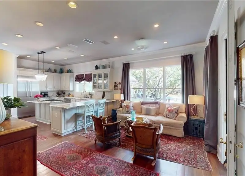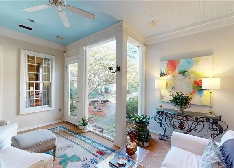 The guest house, built in 2016, is equally impressive. With a Federal-style design and concrete board exterior, it offers 10-foot ceilings, heart pine floors, and a gas log fireplace. Built on a slab foundation, the home is as solid as it is charming. Sunlight pours through the large picture window, creating a welcoming atmosphere.