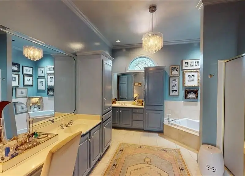 Each bedroom in the main house offers its own ensuite bath. One guest bedroom is located off the kitchen, another off the main hall, and the primary suite sits privately at the back of the house—a serene retreat color-washed in blue—featuring a fireplace, a spacious bath with separate shower, soaking tub, and dual walk-in closets. A separate office or nursery sits adjacent to the primary suite.