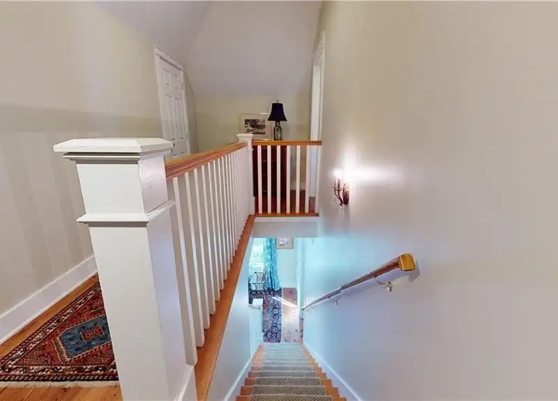 The kitchen, open to the dining area, features white cabinetry, stainless appliances, and a 200-year-old cypress-topped island. The first-floor primary bedroom includes an ensuite bath and walk-in closet, while upstairs you’ll find a spacious second bedroom with carpet, an ensuite bath, and two attic spaces for generous storage.