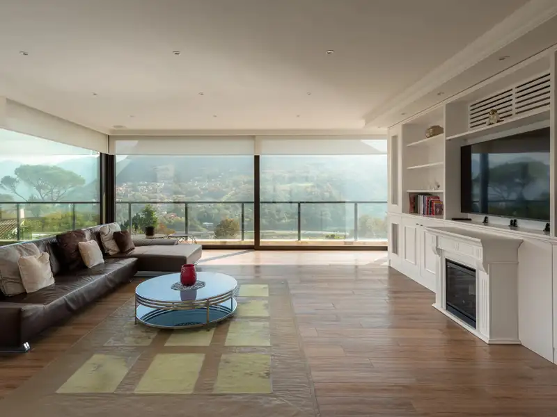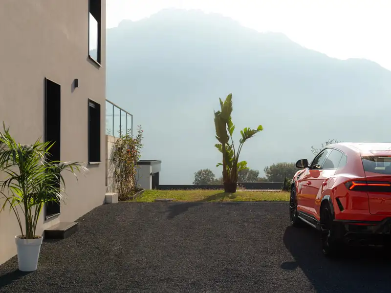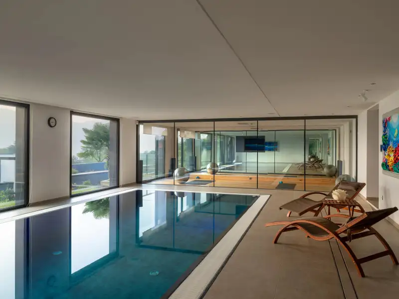 Nestled in the heart of Collina d'Oro, just a short walk from the prestigious TASIS International School, this residence embodies a rare blend of elegance, comfort, and natural light. Every space is designed to offer harmony with the surrounding landscape, combining privacy, wellness, and refined living.On the ground floor, a spacious and elegant entrance hall with a guest bathroom leads to the main living area, where the living and dining rooms open directly into the garden through large windows, bathing the interiors in light and offering a splendid view, the perfect setting for family gatherings or serene evenings with friends.The kitchen, fully equipped and featuring a generous central island, serves as the heart of the home. Ideal for family breakfasts or informal moments, it offers ample space for a dining table of six, leaving the main dining area for special occasions. A convenient dumbwaiter connects the lower level, making it easy to transport groceries and beverages.The same floor hosts two bedrooms, each with its own en-suite bathroom, and a versatile hobby room perfect for use as a playroom, or creative space. The master bedroom, bright and spacious, includes a bathroom with a bathtub and direct access to the garden, while an adjoining study with wardrobe and private bathroom provides an ideal retreat for work or reading.As you move towards the lower level, a stunning original sculpture by Nag Arnoldi, valued at approximately CHF 300,000, graces the stairway landing, adding a unique artistic touch that enhances the property's sophistication and character.The lower floor opens to a true wellness sanctuary. The indoor heated pool with direct garden access and shower area invites relaxation in a bright, serene atmosphere. The fitness room, separated by a long glass wall, allows one to exercise while overlooking the pool, and the SPA area with sauna, steam bath, and whirlpool offers a private haven for body and mind.This level also features a self-contained apartment with living room, kitchen, bedroom, and bathroom, perfect for guests or staff, as well as a private cinema room for exclusive entertainment. Service areas such as a laundry room, technical space with structured cabling, and an internal garage complete the lower floor.Surrounded by the lush landscape of Collina d'Oro, the property offers a lifestyle immersed in nature, culture, and tranquility. Picturesque walking trails, fine dining, and cultural landmarks such as the Hermann Hesse Museum in Montagnola create a setting where leisure, sophistication, and well-being merge seamlessly.Living here means embracing a life where nature, art, and elegance coexist in perfect harmony, with the convenience of TASIS just a few minutes away and the refined quality of life that defines the Ticino region.