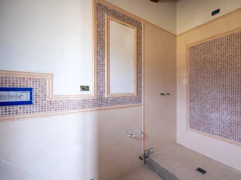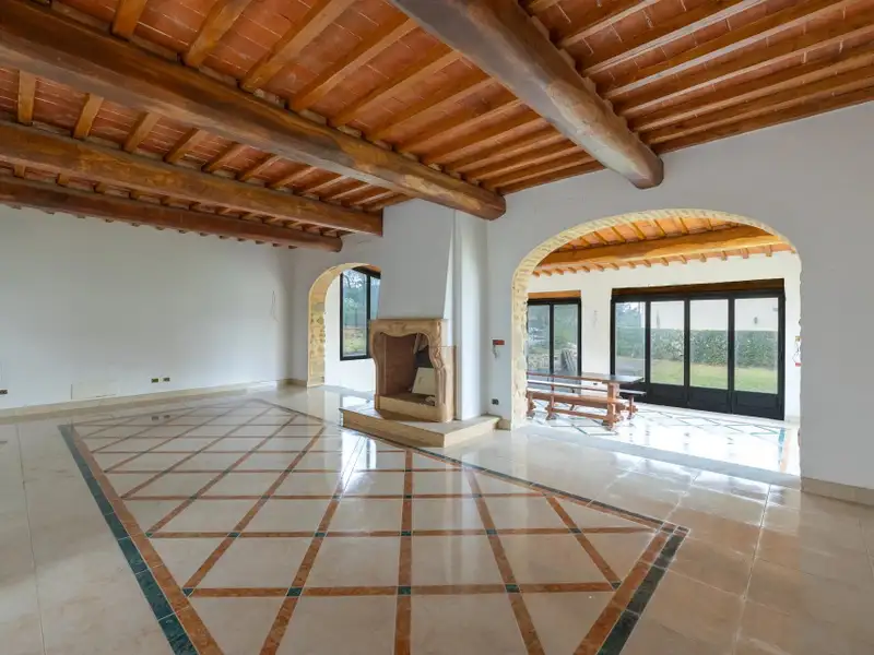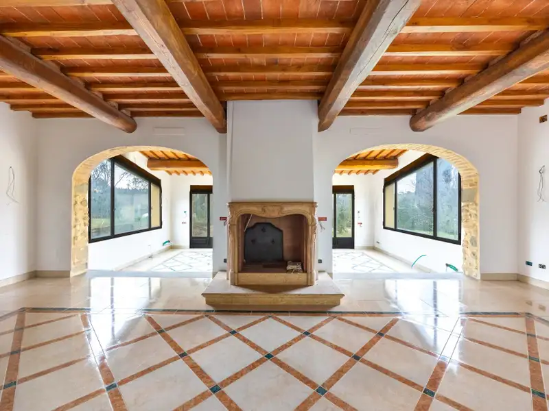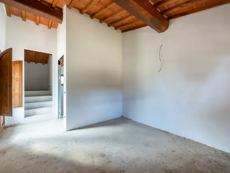 On the ground floor there are two large communicating living rooms with fireplace, a kitchen, a service bathroom and various accessory rooms. On the first floor, three bedrooms, two bathrooms, a utility room and a large terrace overlooking the surrounding countryside.