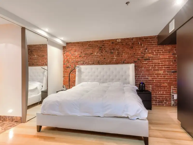 - Exposed brick and wood beams