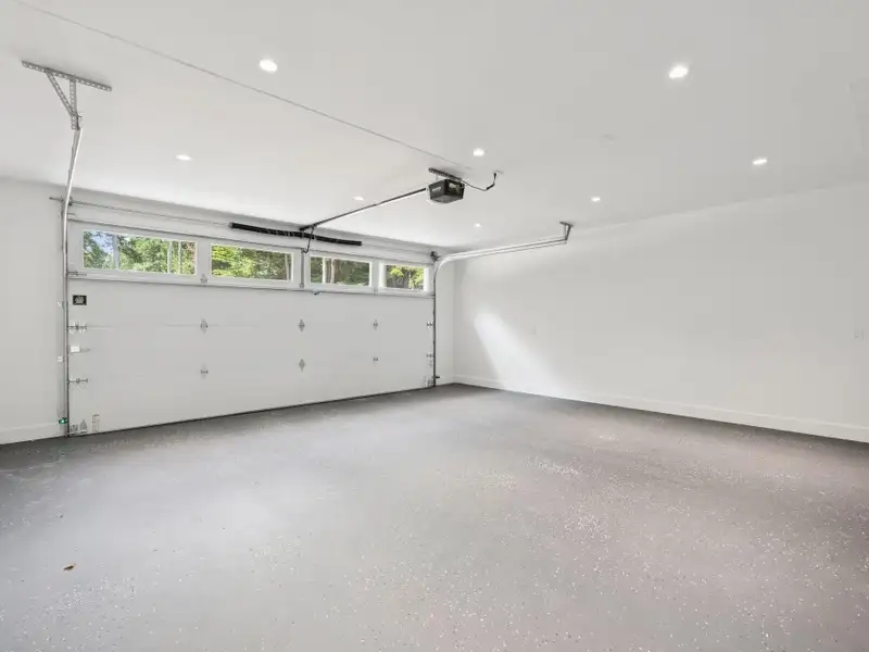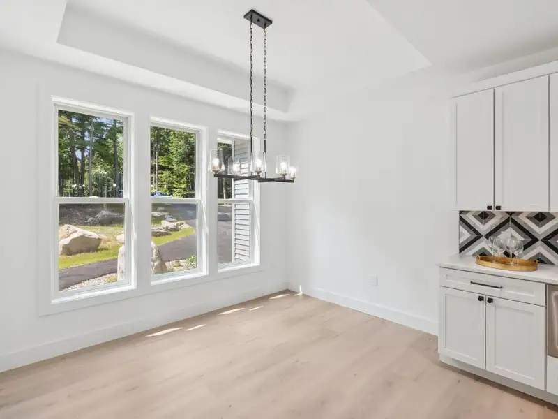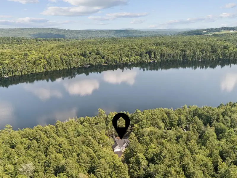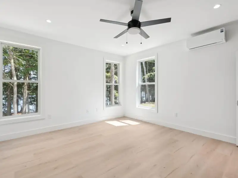 - Large windows with lake views