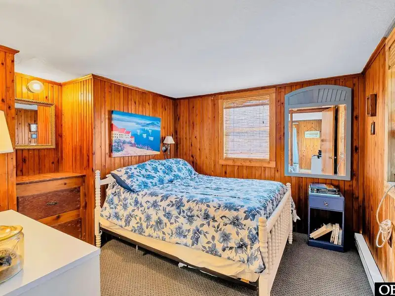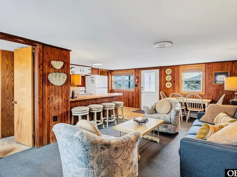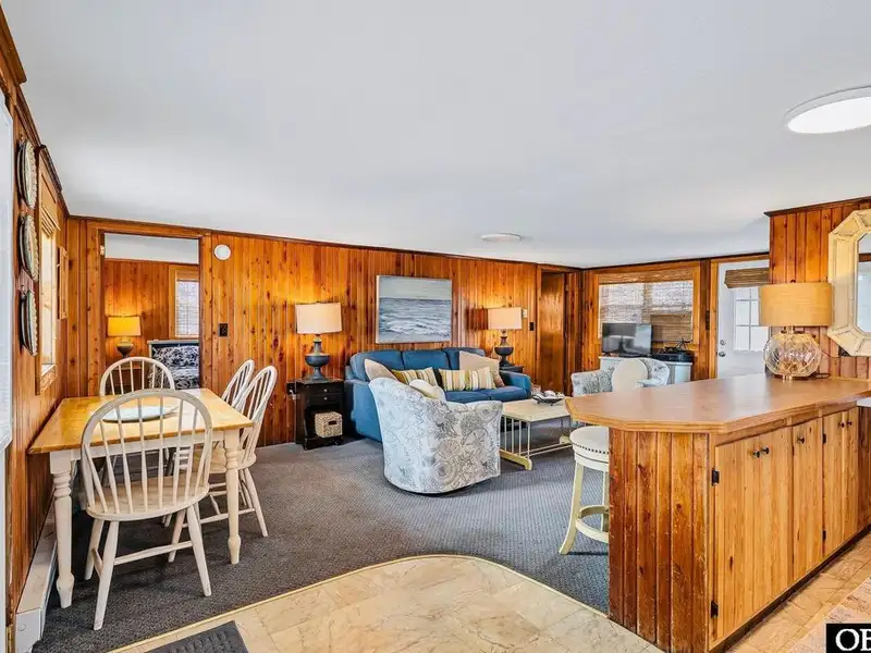 - Open floor plan with cozy wood interior