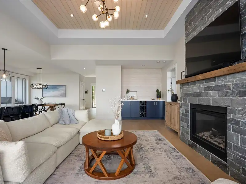 - Floor-to-ceiling rock fireplace