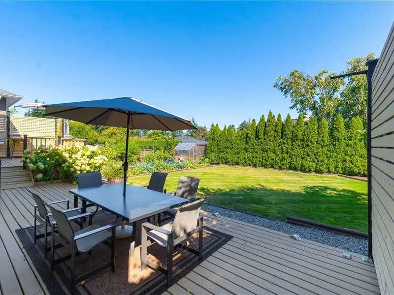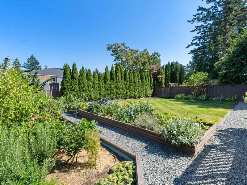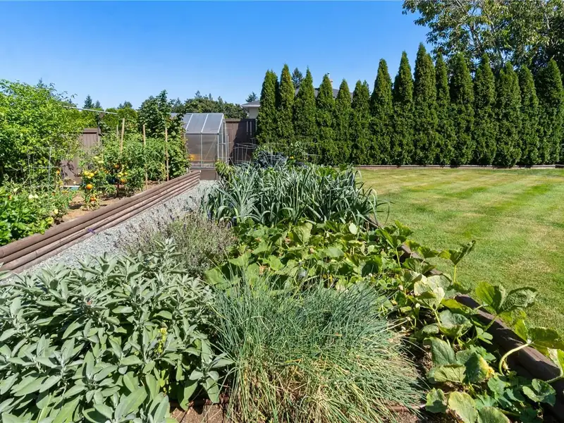Step outside to your fully fenced private oasis with a fully irrigated vegetable and herb garden, including tomatoes, peppers, jalapenos, kale, celery, leeks, chives, rosemary, sage, cilantro, marjoram, & raspberries. A greenhouse, large deck, and grassy yard complete the space - perfect for relaxing, gardening, or entertaining.