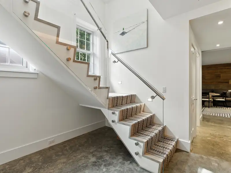 - Custom glass and wood staircase centerpiece